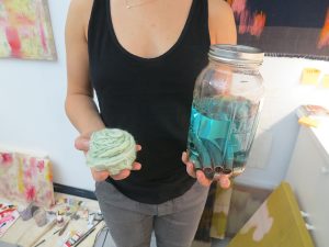 Copper-dyed yarn, and a jar of copper dye being prepared. Photo: Quinne Myers.