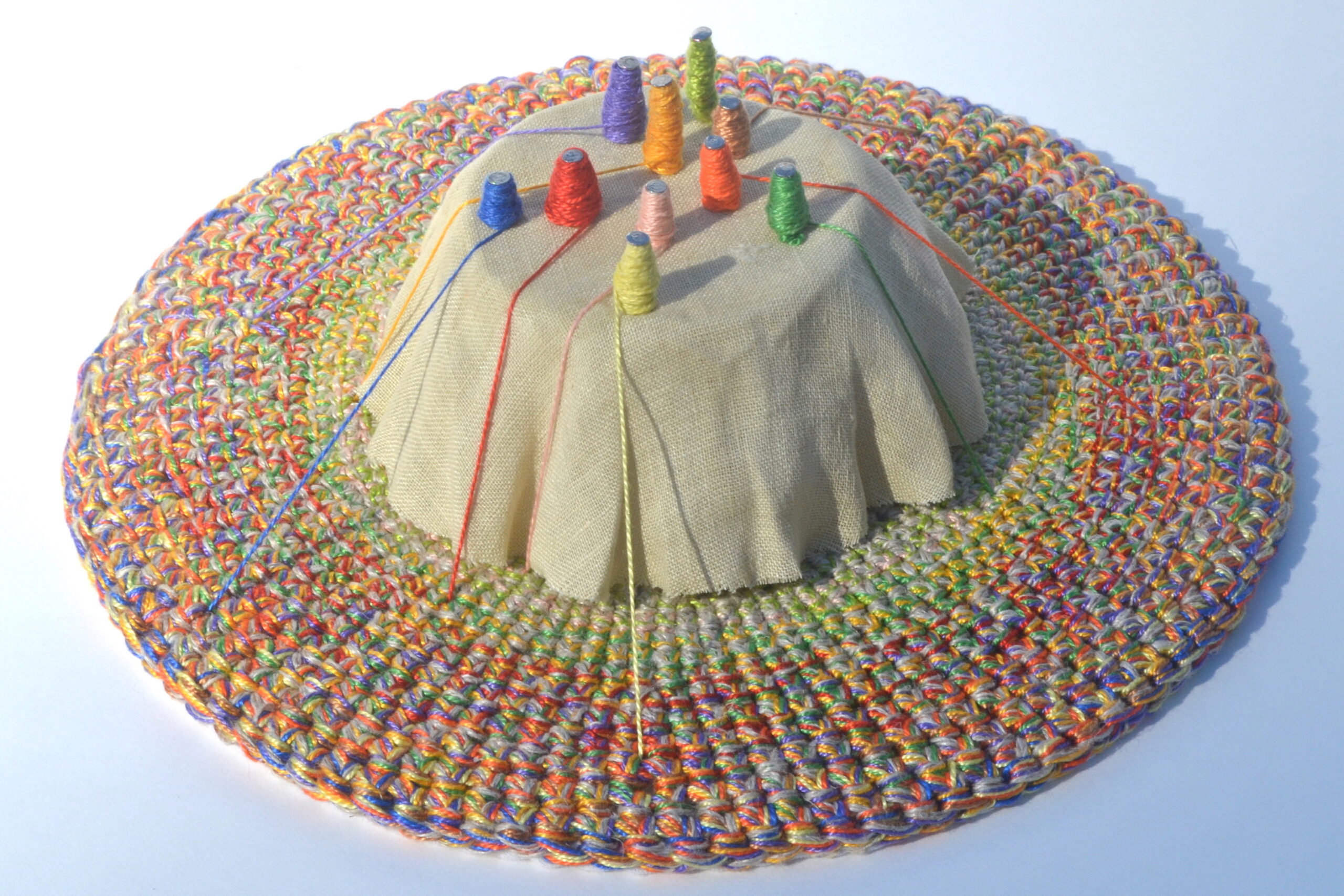 This piece is about the process of crochet. The different colors of thread sit in spools on the table, ready to be used, and more and more of them are incorporated into the work as it progresses. The richness of the final cloth comes from the variety of different threads which have become part of it.