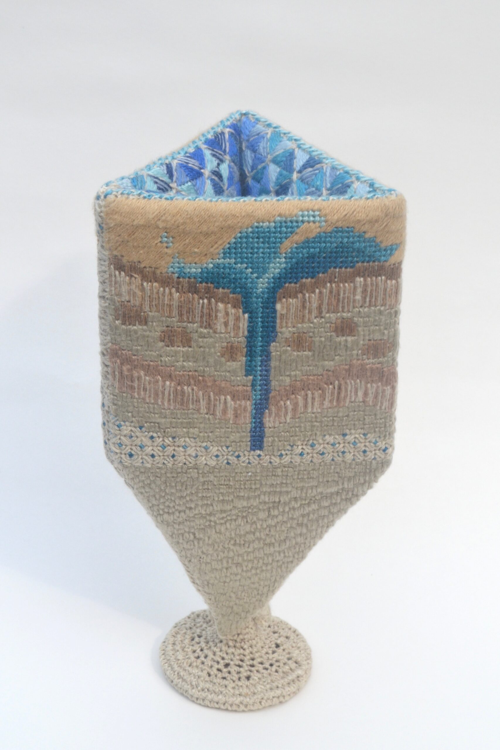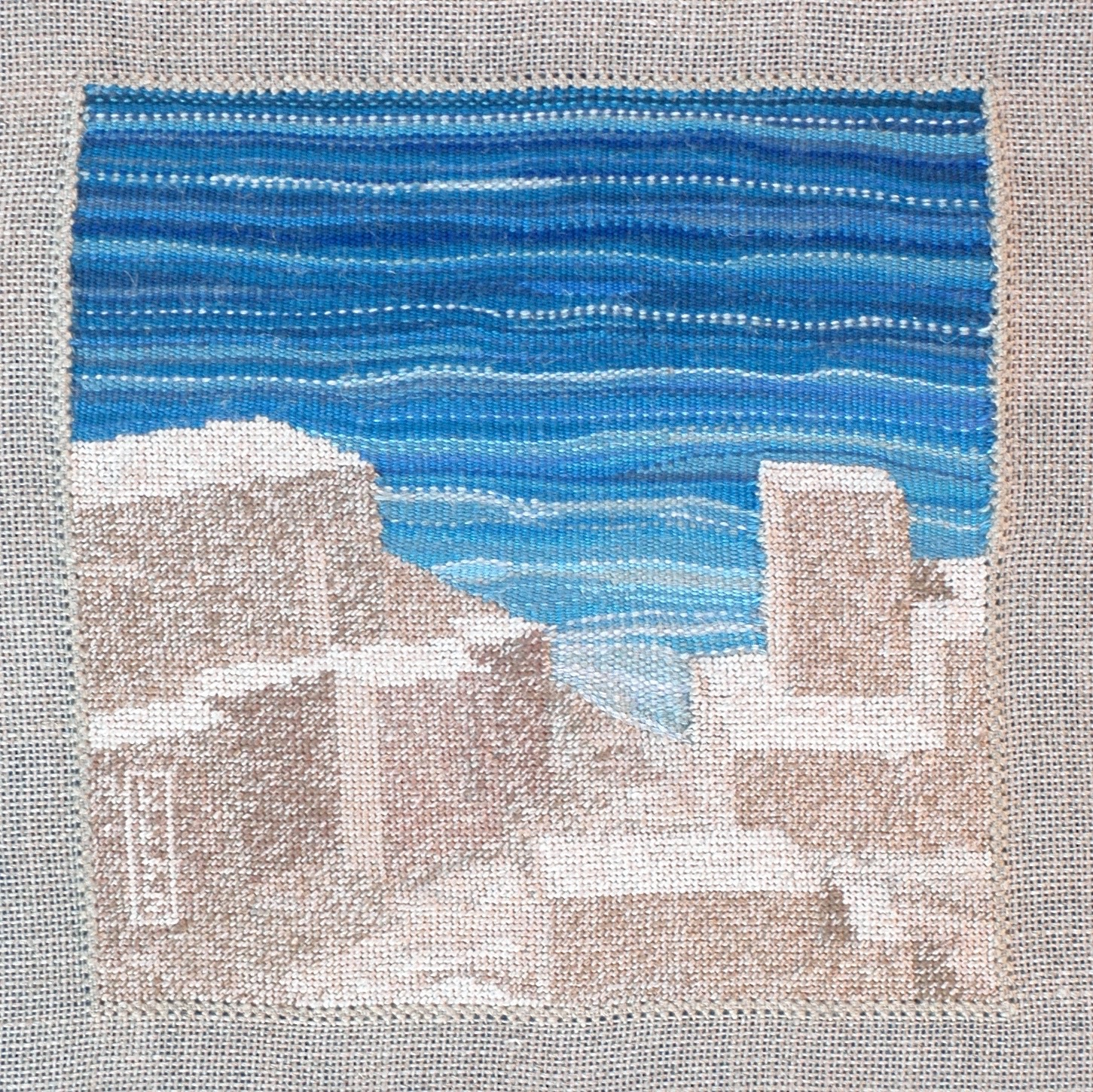 This shoreline connects the sea and dry land. It also connects the more fluid medium of tapestry with the more rigidly structured tent-stitch embroidery, which has often been called tapestry embroidery. From the land side, one can see the sea through large buildings---or are they sand castles? This weaving and embroidery was inspired by Tel Aviv, the White City, a showcase of Bauhaus architecture built on coastal dunes.