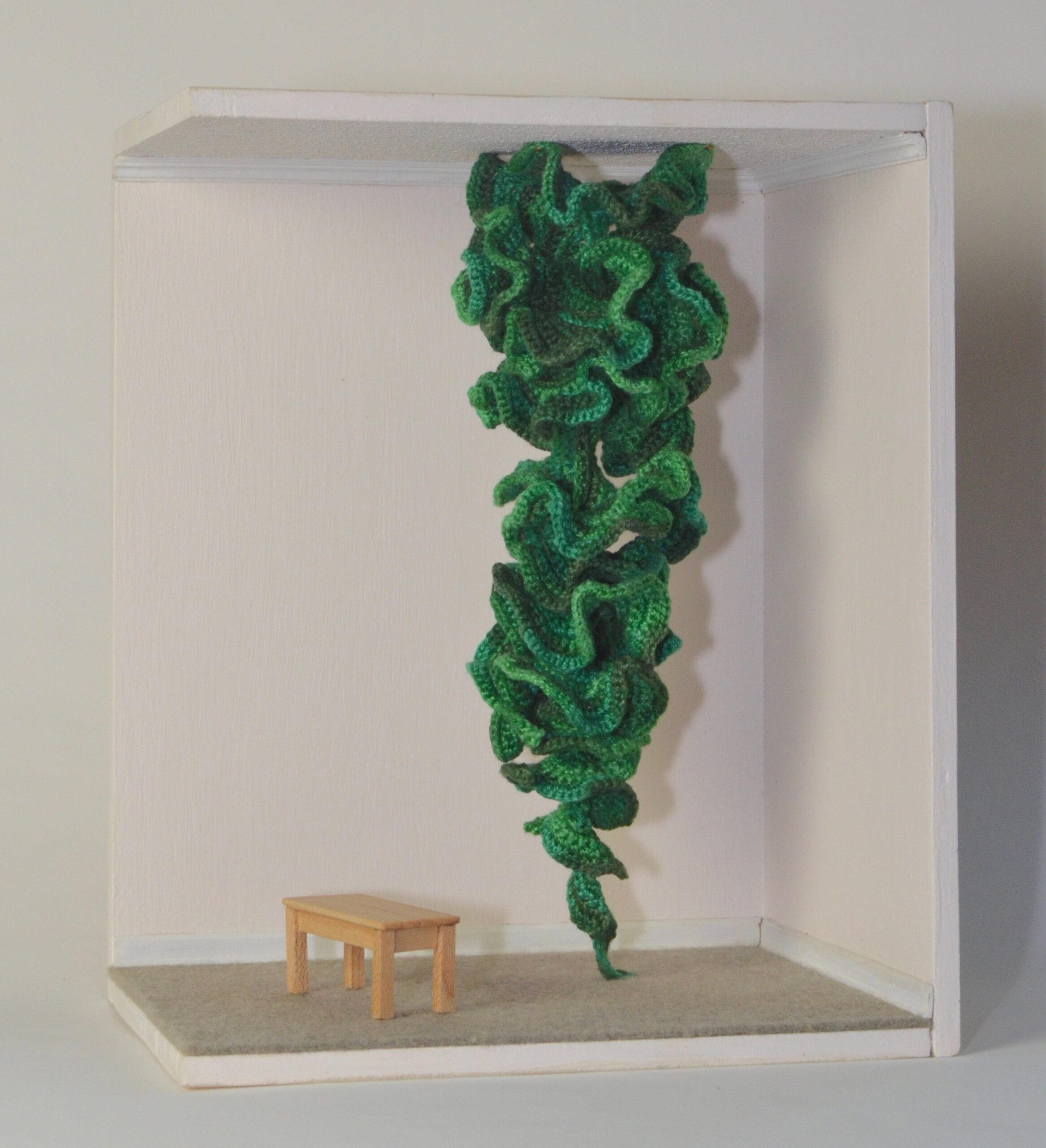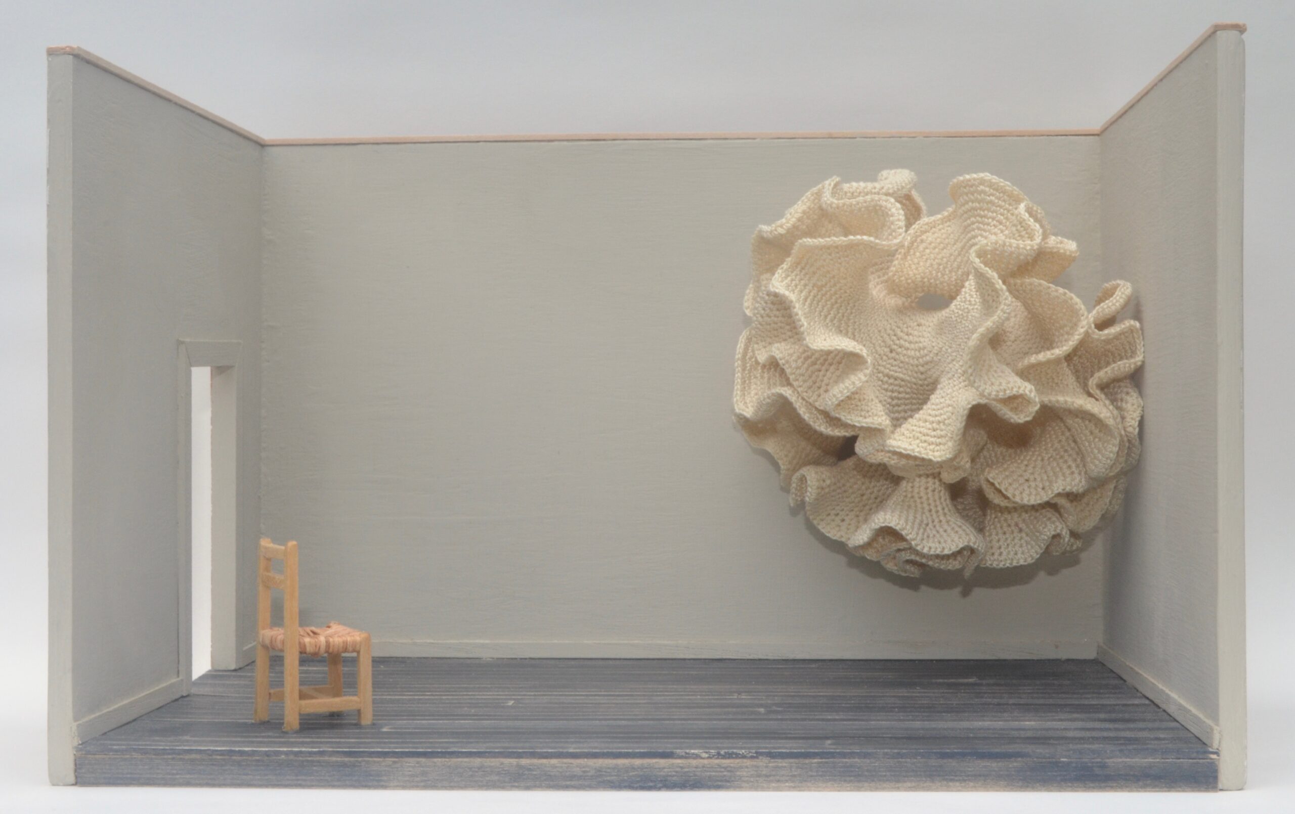 This piece is part of my hyperbolic series which consists of crocheted hyperbolic surfaces, each housed in a miniature room with a chair for the viewer. Hyperbolic surfaces can be made using crochet by keeping increasing stitches at a fixed rate. This leads to a lot of ruffles. Every consecutive row increases the ruffling and can qualitatively change the feel of the whole piece---almost as if the surface were alive. This appealed to me because I always look for ways to mix predictability with unpredictability---and what could be more predictable than crocheting long rows in a single stitch with a single thread? It also makes the process addictive: soothing and exciting simultaneously. The basic parameters---what thread you use, what rate of increase of stitches, whether you work in rows or in the round---affect the look of the surfaces dramatically, and so different hyperbolic pieces have had very different meanings for me. This one is about loss. The evolving nature of the white surface as it was being worked is analogous to the development of a relationship between two living people. Both go on for a period of time, undergoing many changes, but then at some point the work is done and the thread is cut, or the people are separated and all you have left is the chance to contemplate the relationship as it was.