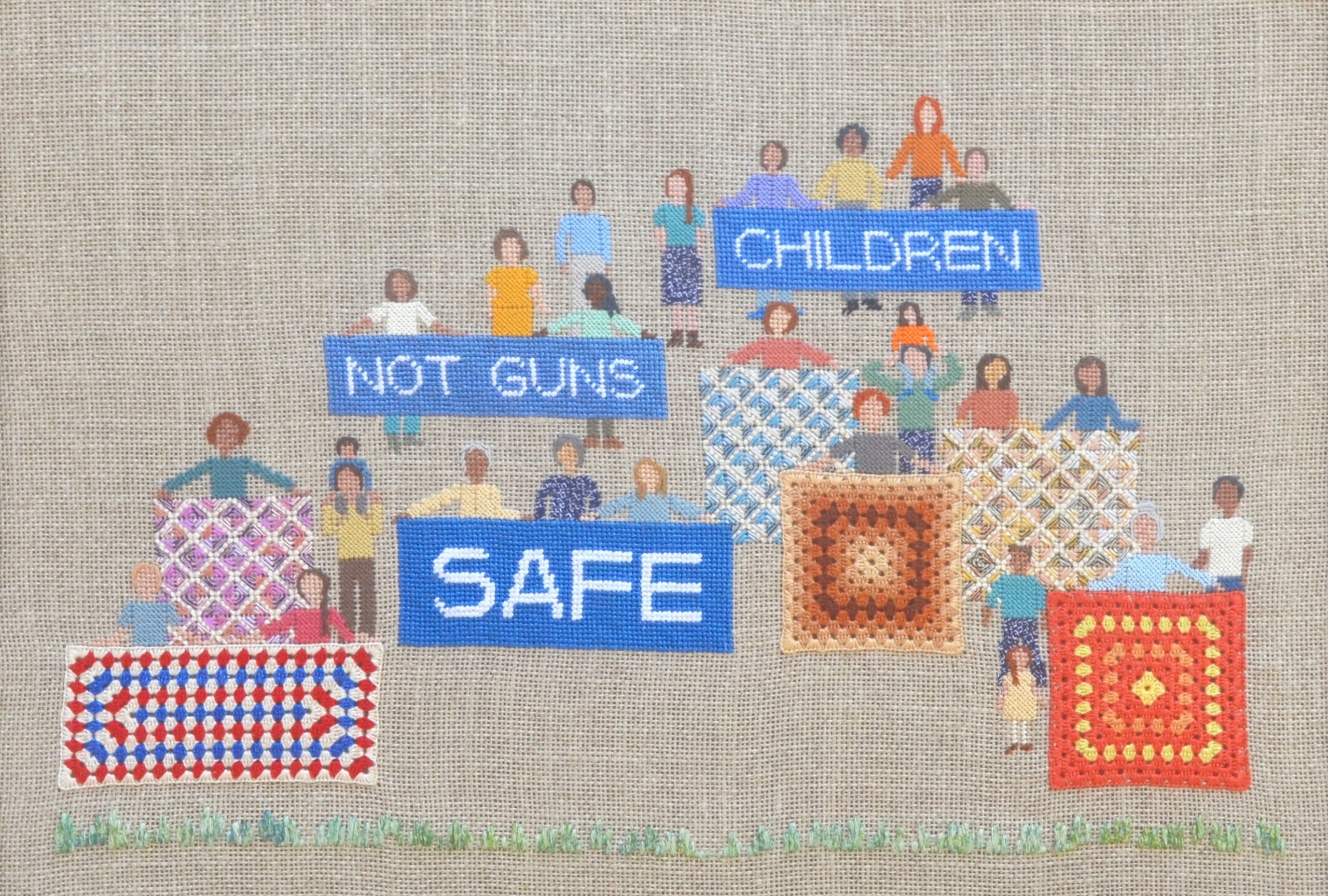 This piece was my response in fiber to the demonstrations across the US on March 24, 2018: people of all ages standing together trying to use determination, signs, and in my version also quilts and afghans to form a barrier shielding children from guns. Hand-stitched quilts and afghans are not very effective as physical barriers, but not knowing how to provide physical protection, I kept embroidering them.