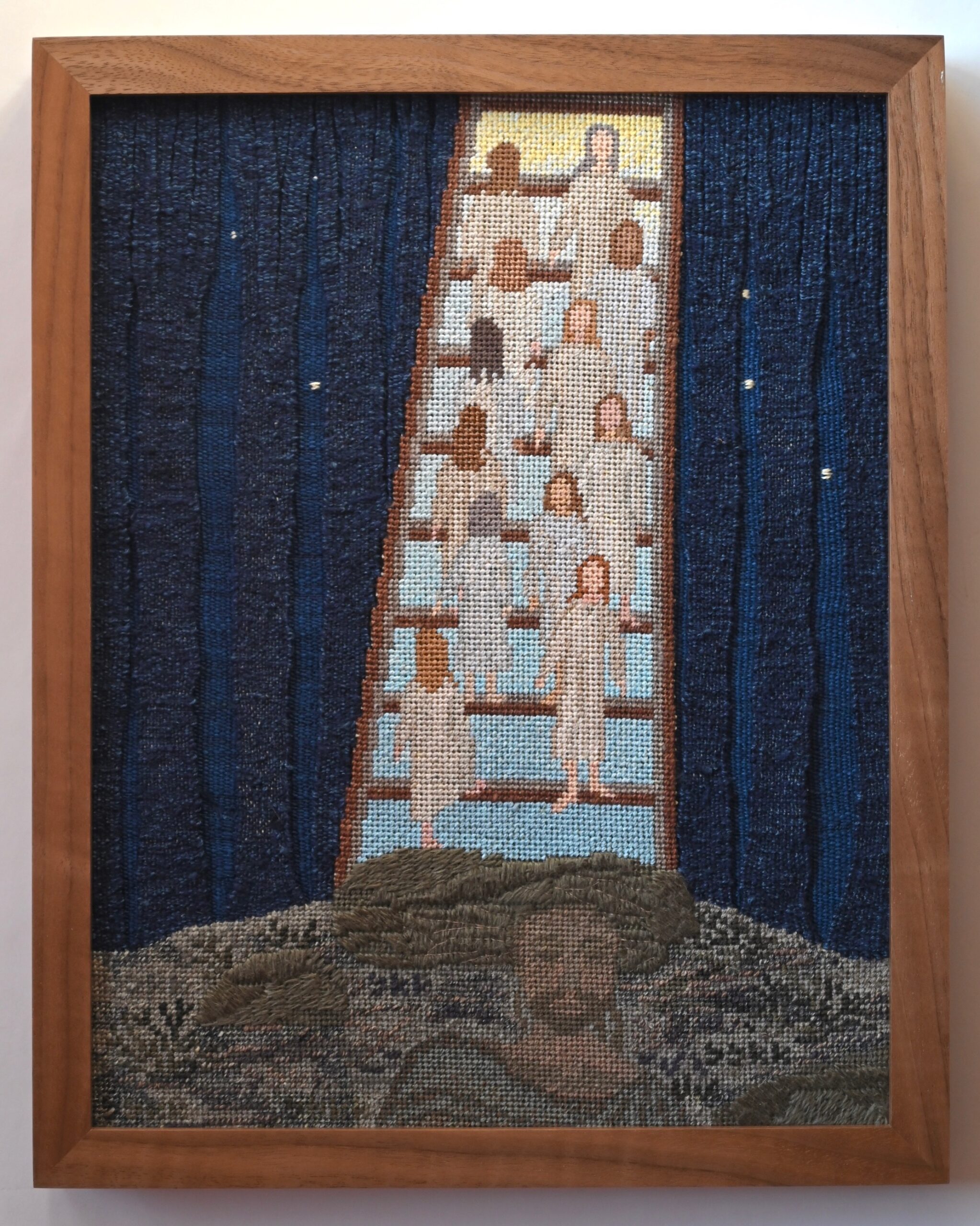 silk, wool, cotton, and linen on cotton canvas 10" w x 12.5" h