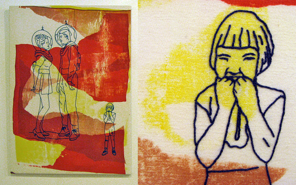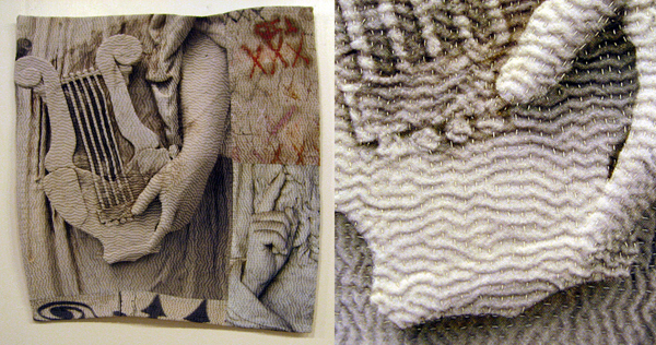 Teresa Paschke of Ames, IA received the 2nd place award for A.K. (2011), a digitally printed and hand-embroidered piece from a travel-inspired series that attracted attention during the 2011 SDA conference in Minneapolis. Jill Rumoshosky Werner of Wichita, KS took home the 3rd place award for her disconnected quilt composition Miscalculated (2009). Chicago-based emerging artist Aviva Alter provided evidence of less formal compulsions with Inside a Crowded Place and Winter Fragments 1 (both 2011). Oddly refreshing and a bit revolting, these abject departures from the norm were made of felted wool, gauze, wire, glue and hundreds of pins. The show also afforded opportunities to see exceptional works by many established artists like Shin-hee Chin (McPherson, KS) and Arturo Alonzo Sandoval (Lexington, KY).