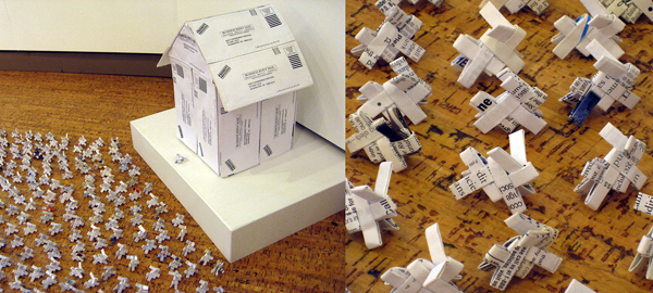 Venturing beyond the city limits, I was treated to an extra day of gallery hopping by my fabulous hostess Zoe Perkins (Textile Conservator, Saint Louis Art Museum). Our first stop in nearby Edwardsville, IL featured a sampling of recent textile pieces made by Southern Illinois University (SIUE) alumni at the Edwardsville Art Center. The selection, curated by artist and SIUE faculty member Laura Strand, offered a variety of fresh fiber forms including politically charged wearables by Bridget Kraft, handstitched photographic-print pieces by Luanne Rimel, dyed and felted wall works by Angela Perkinson, and a charming stampede of tiny bunnies made out of credit card junk mail by Christine Holtz.