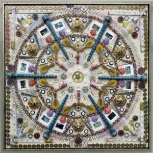 My mandalas range from a single, ten-inch vintage quilt block to larger sections measuring 32″ square. The presentation of the mandala series was worked out before the first one was stitched. I don’t use any glue. Everything is hand-stitched in place, with some found objects having pre-drilled holes.