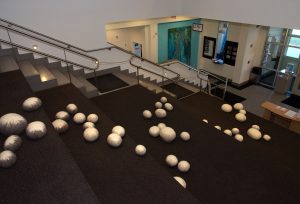 Kristina Goransson’s site specific work Drained and Amy Genser’s Neptune as viewed from the upper gallery. Gesner’s piece won the SDA Award of Excellence and was featured on all the publicity materials.