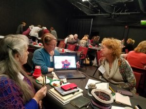 Kimberley Harding, Jennifer Lee Morrow, and Sylvia Vander Sluis share websites at their morning table.