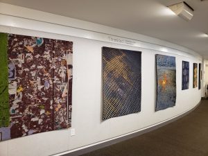 I strive for flow in my studio time but was also pleased to find it recently in a one-day gathering at the Mosesian Arts Center in Watertown, Massachusetts. New England states share the beauty of their waters from ocean to bays to lakes to rivers and streams, and on this day about 50 artists also enjoyed sharing–images, stories, tips, art, and fun. This image, from the upper gallery, is of Kristina Goransson’s Drained, a collection of felted stones tumbling down wide platforms set between two staircases, as it flows to Amy Genser’s Neptune created from tightly rolled strips of paper and layers of paint. For me, this arrangement mirrored the New England SDA members who flowed between the two floors of the Mosesian chatting, networking, admiring art, and feeling the energy created from in-person interactions.