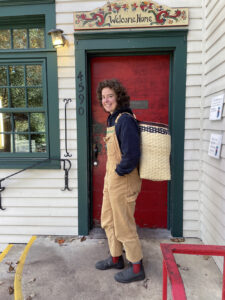 Allie at John C. Campbell Folk School wearing a pack basket made during a Folk School workshop, November 2021. Photo: Tommye Scanlin.