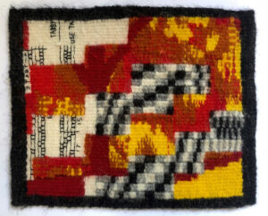 Allie Dudley, A&B Wedding Coverlet, 2021. Woven with cotton and wool using the Double Compass Work draft from Margeurite Davison’s A Coverlet Weaver’s Source Book, 10.5 x 13 inches. Photo by the artist.