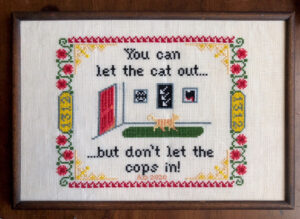 Allie Dudley, You Can Let the Cat Out, 2020. Cross-stitched with cotton embroidery floss, linen, 10 x 14 inches. Photo by the artist.