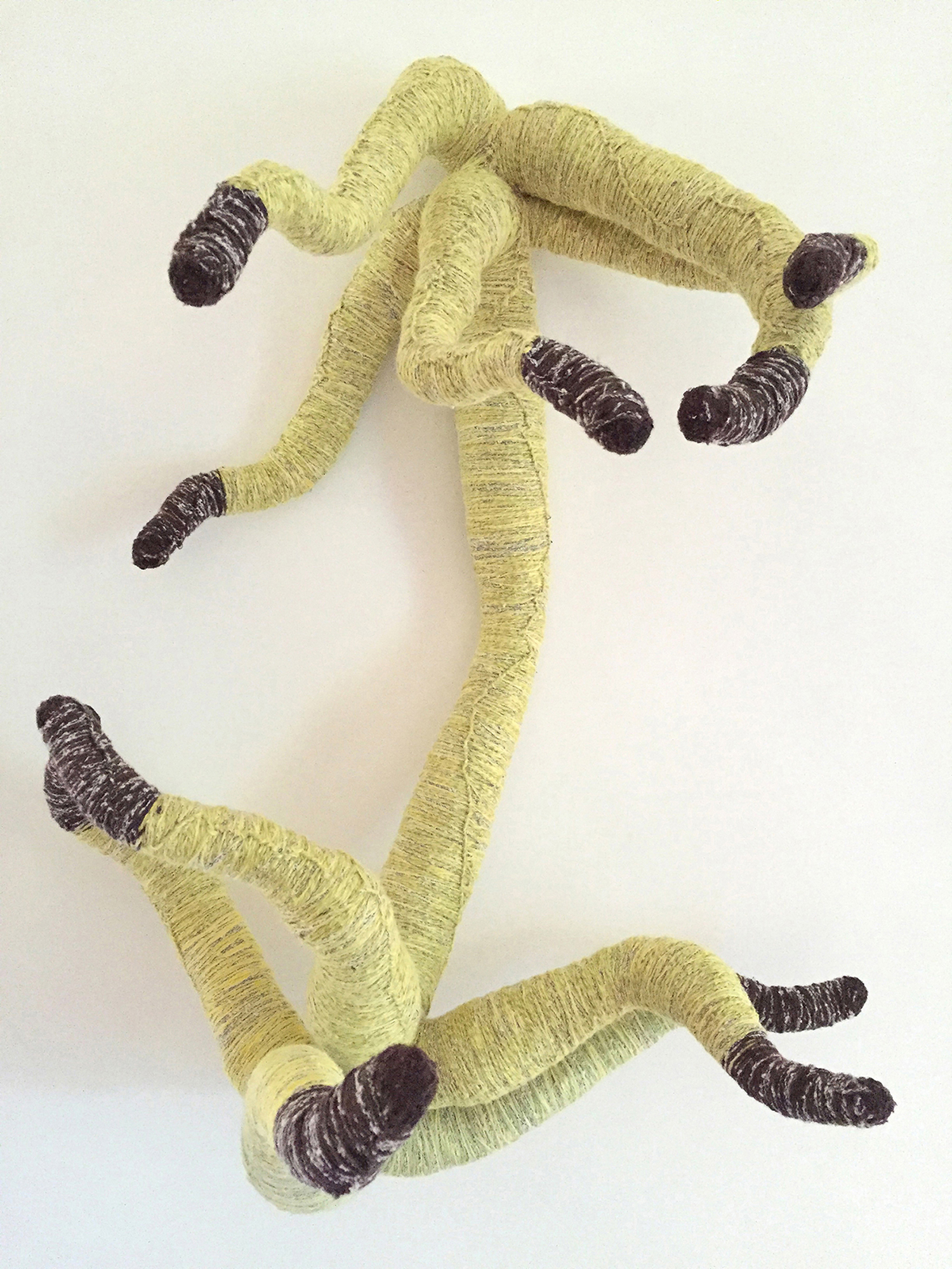 wood, cotton thread, toothpicks, ceramic, screws, pigmented polymer medium 9 3/4" x 10" x 1 1/2"