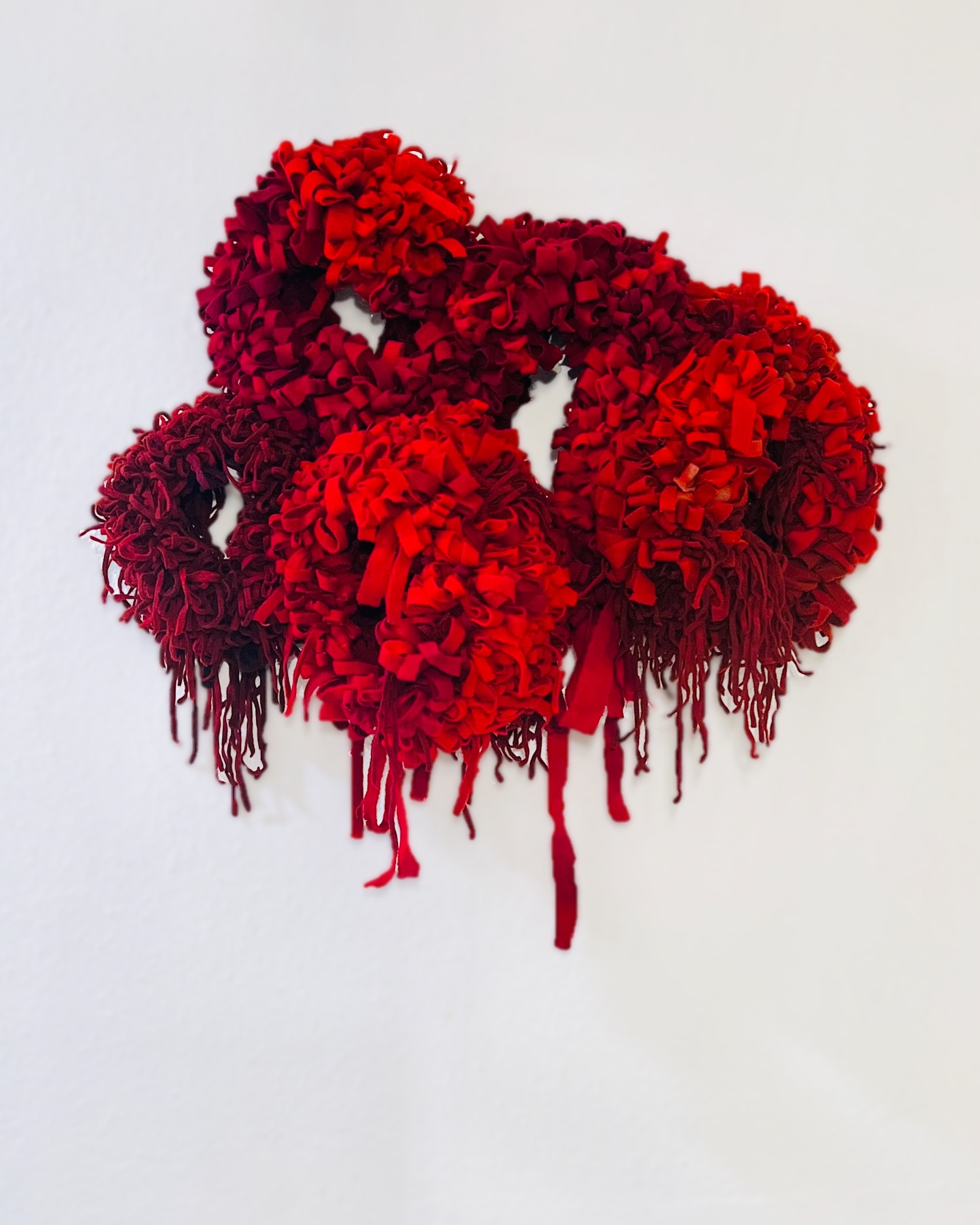 Created using upcycled wool and scraps redyed. Hooked through wire armatures created from repurposed jewelry wire.