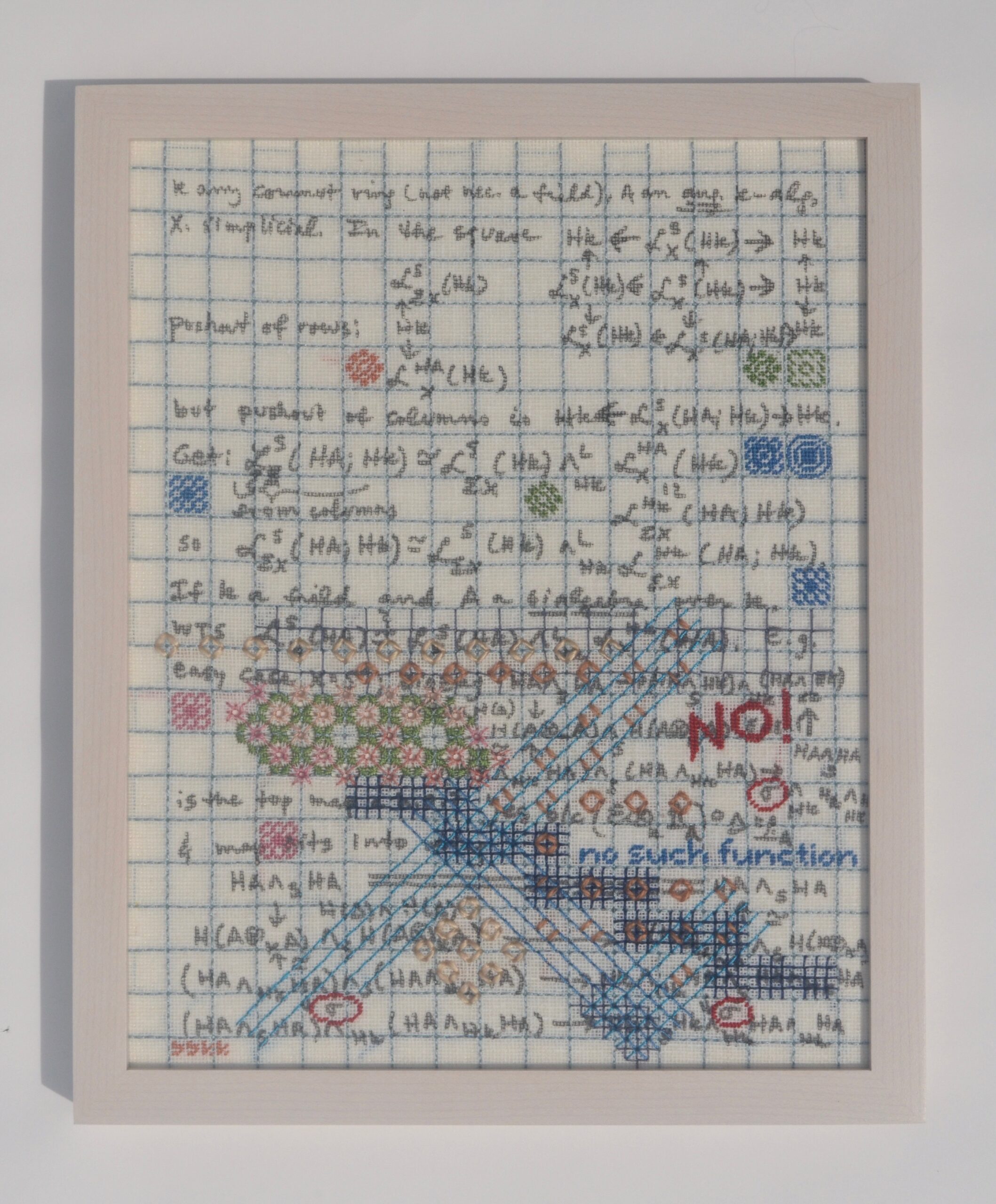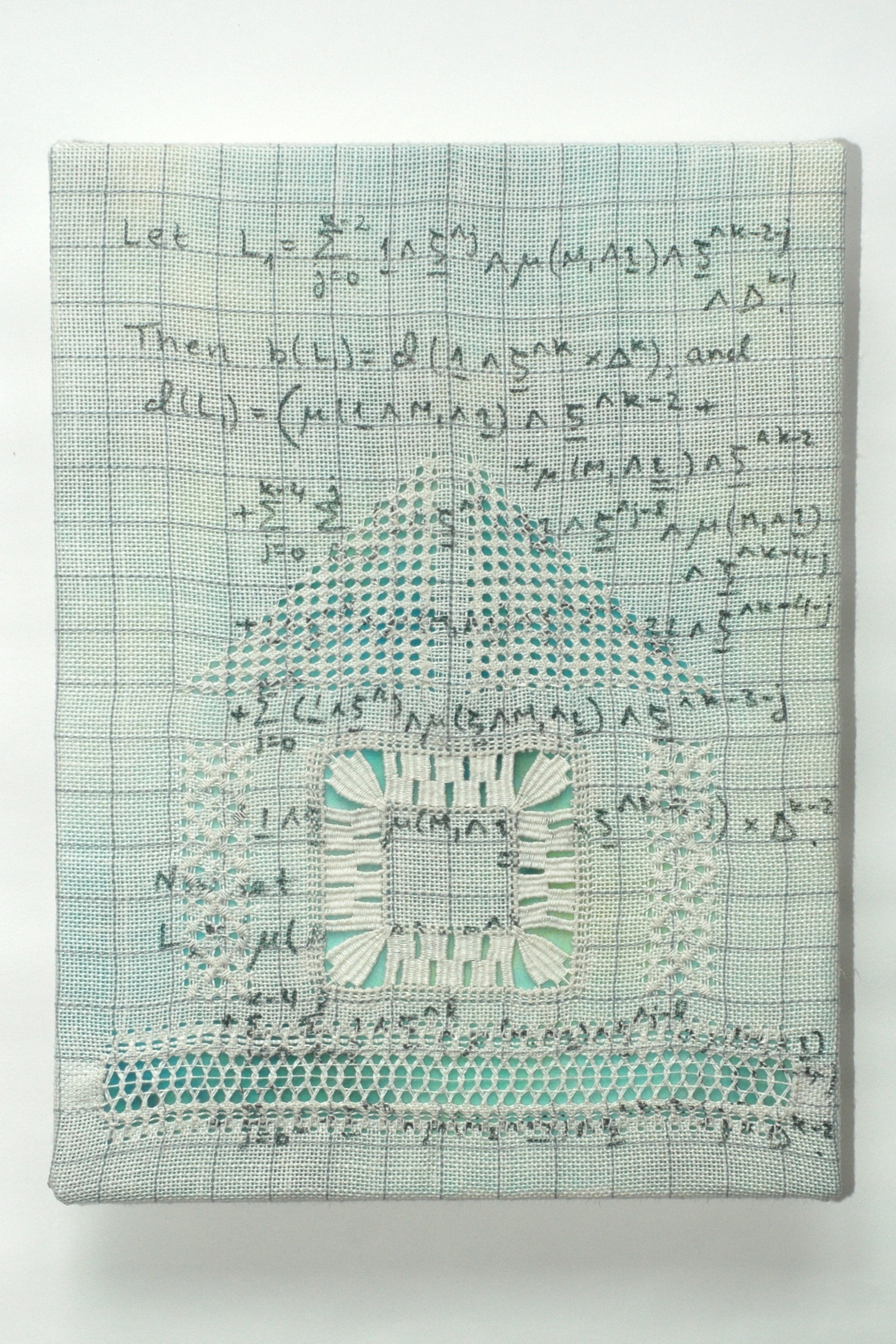 When I was a child, we used the backs of my father's calculations as art paper. So paper with lots of calculations on it still seems a very inviting thing to draw on... These days, I do calculations of my own, and I like to scribble a lot on the paper I use. I tried to scribble in needle and thread on the calculations on this fabric.