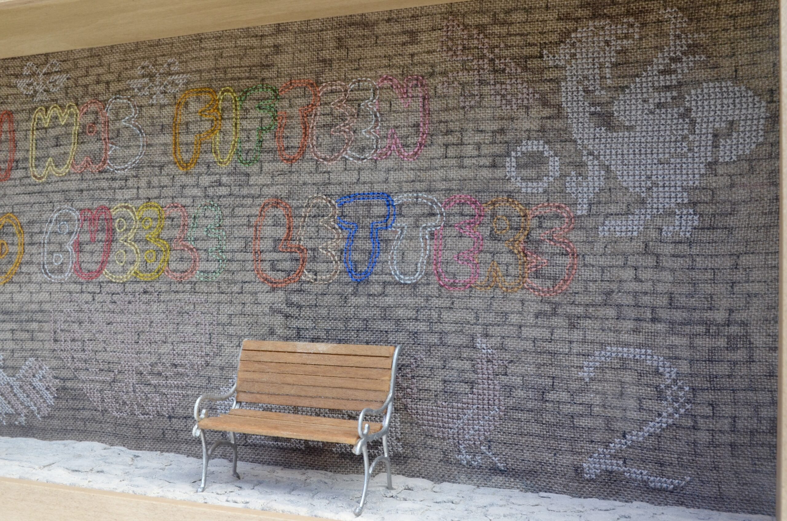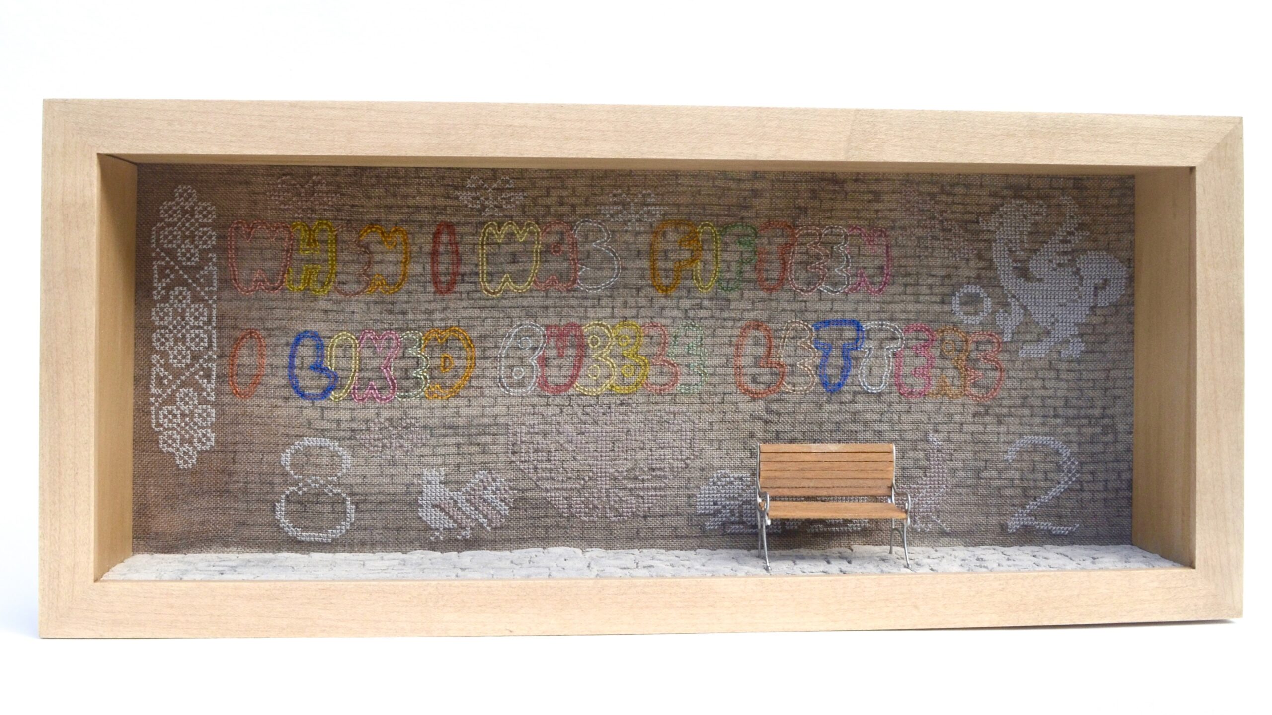 silk thread, linen fabric, purchased small bench, wood; fabric paint, resist, fabric marker, paint, stain and powdered “stone” compound 7.5” h 17” w 2.5” d