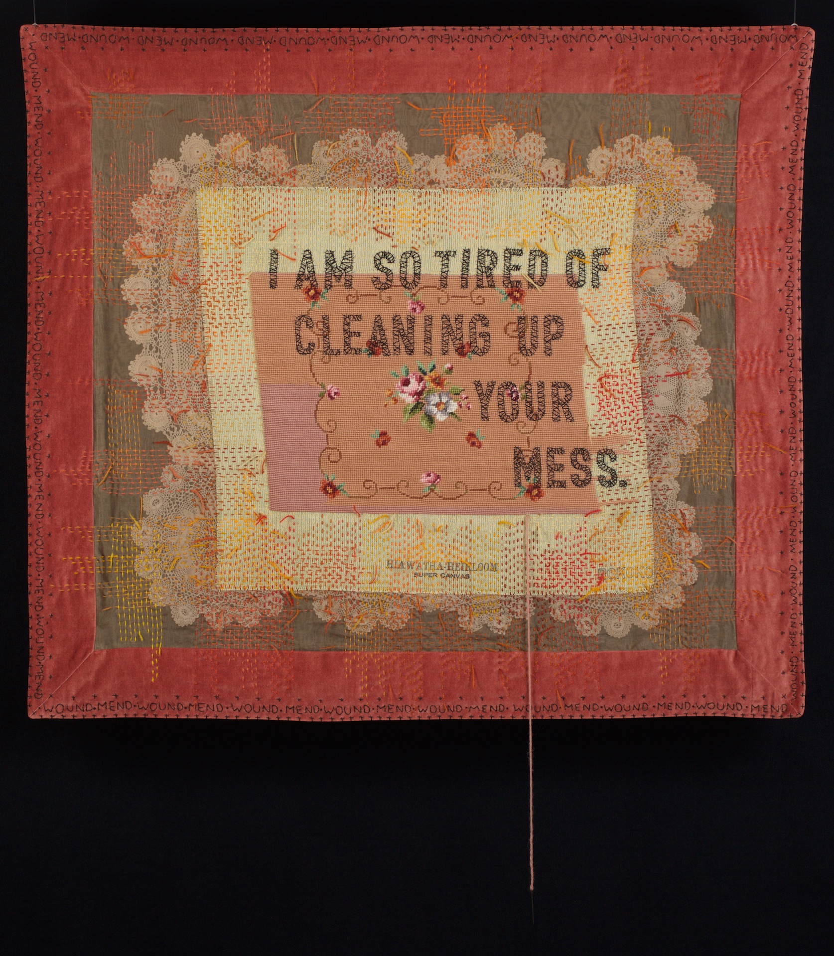 Abandoned quilt, vintage doilies & unfinished embroideries, wool, silk organza, stones. 57” W x 85” H