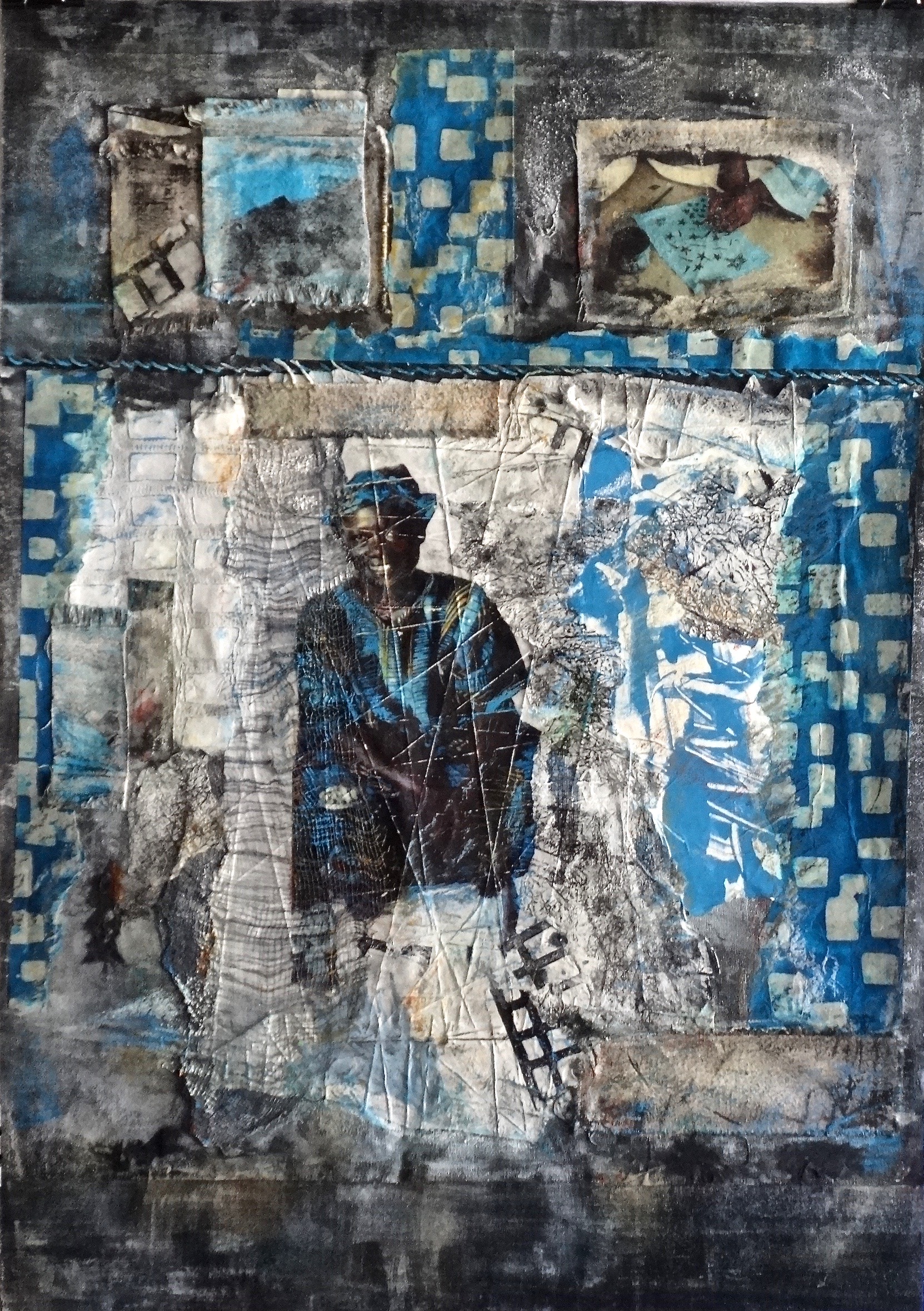 Painted, cut & sewn canvas w/ African transfers, netting dipped in paper pulp, & mixed media 18” W x 31.5 “ H