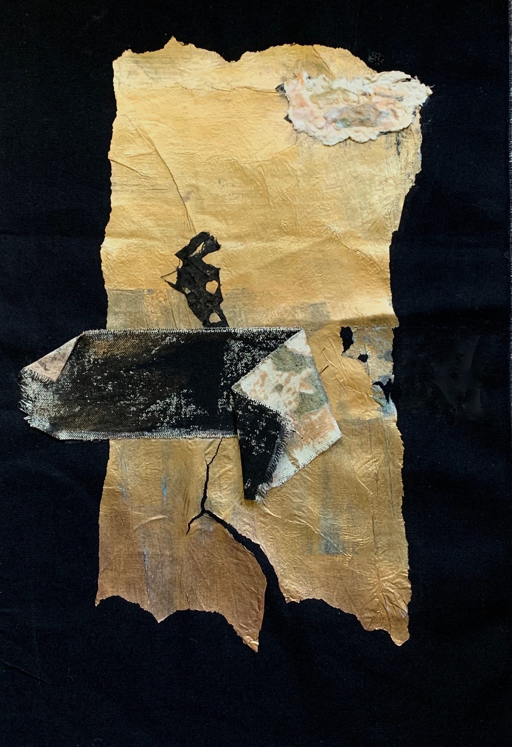 I was trying to get the essence of a Japanese warrior and the feeling of time, while using a minimum of materials. I painted tissue paper with gold paint. As I laid it on the canvas, the tears in the paper started suggesting a human. Then when I added more canvas to evoke a belt, it
