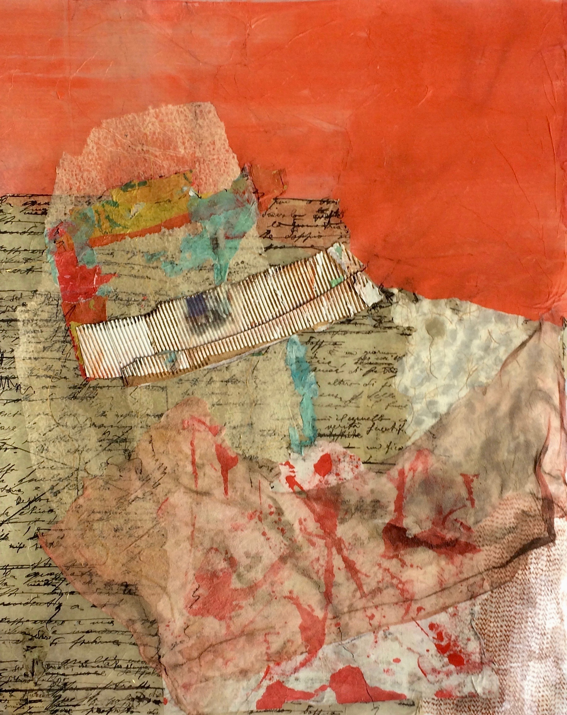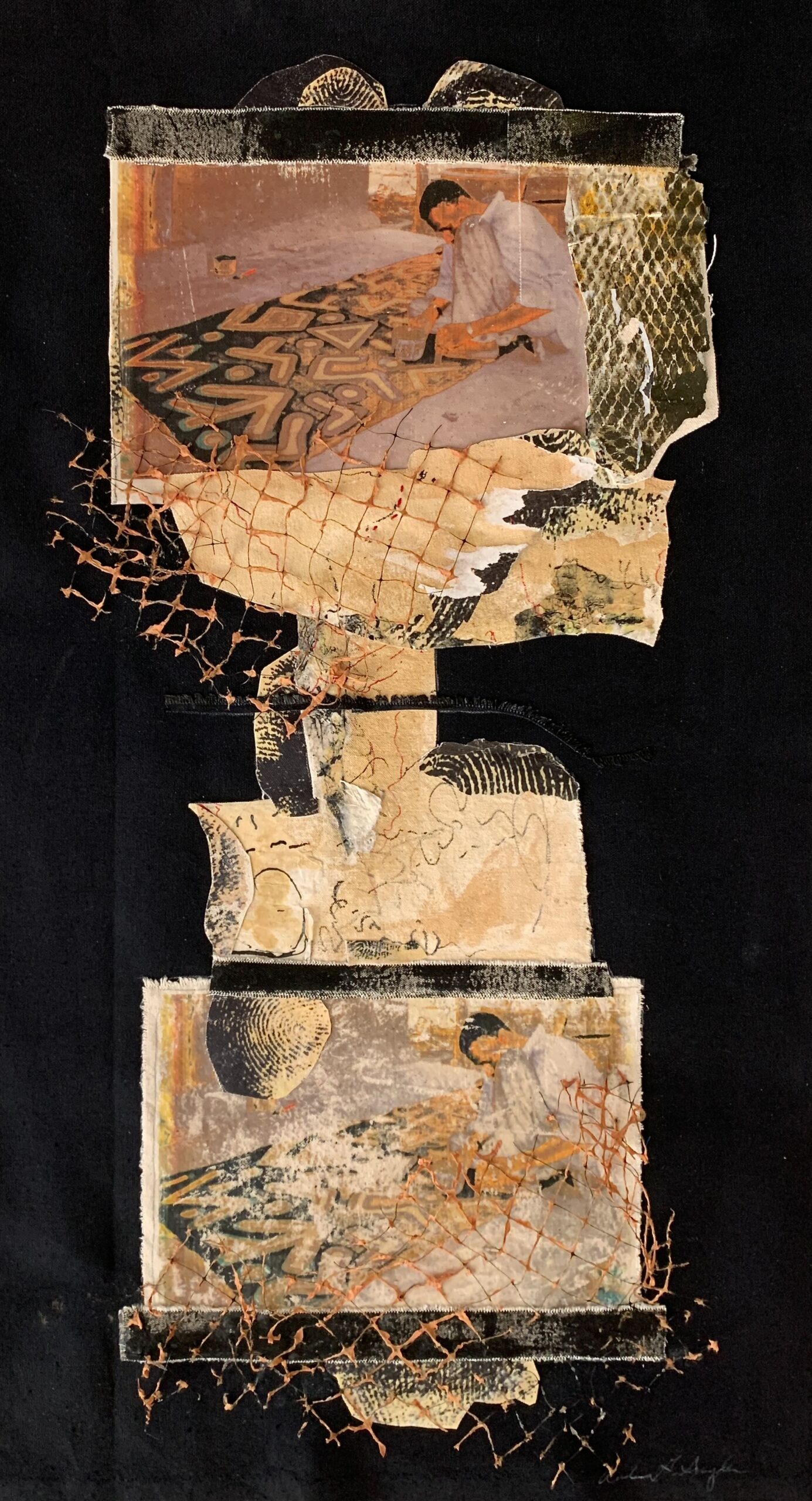 Cut & sewn canvas dry brushed and laminated with Asian papers, cheesecloth, transfers, & monotypes 35.5” H x 27” W