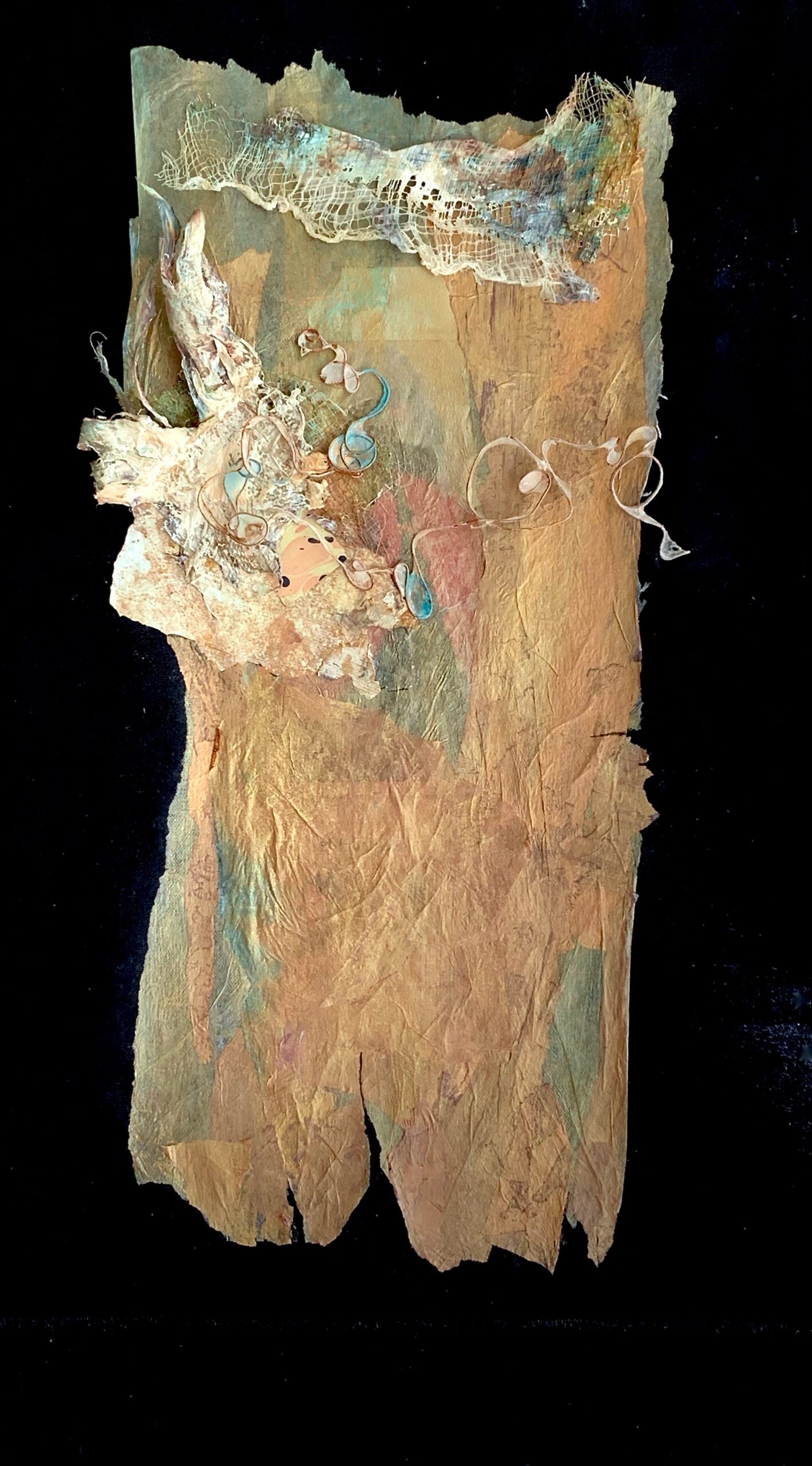 Handprinted papers, funded Kozo fibers, copper wire, bark and cheesecloth on black canvas 20 1/2" W x 28" H