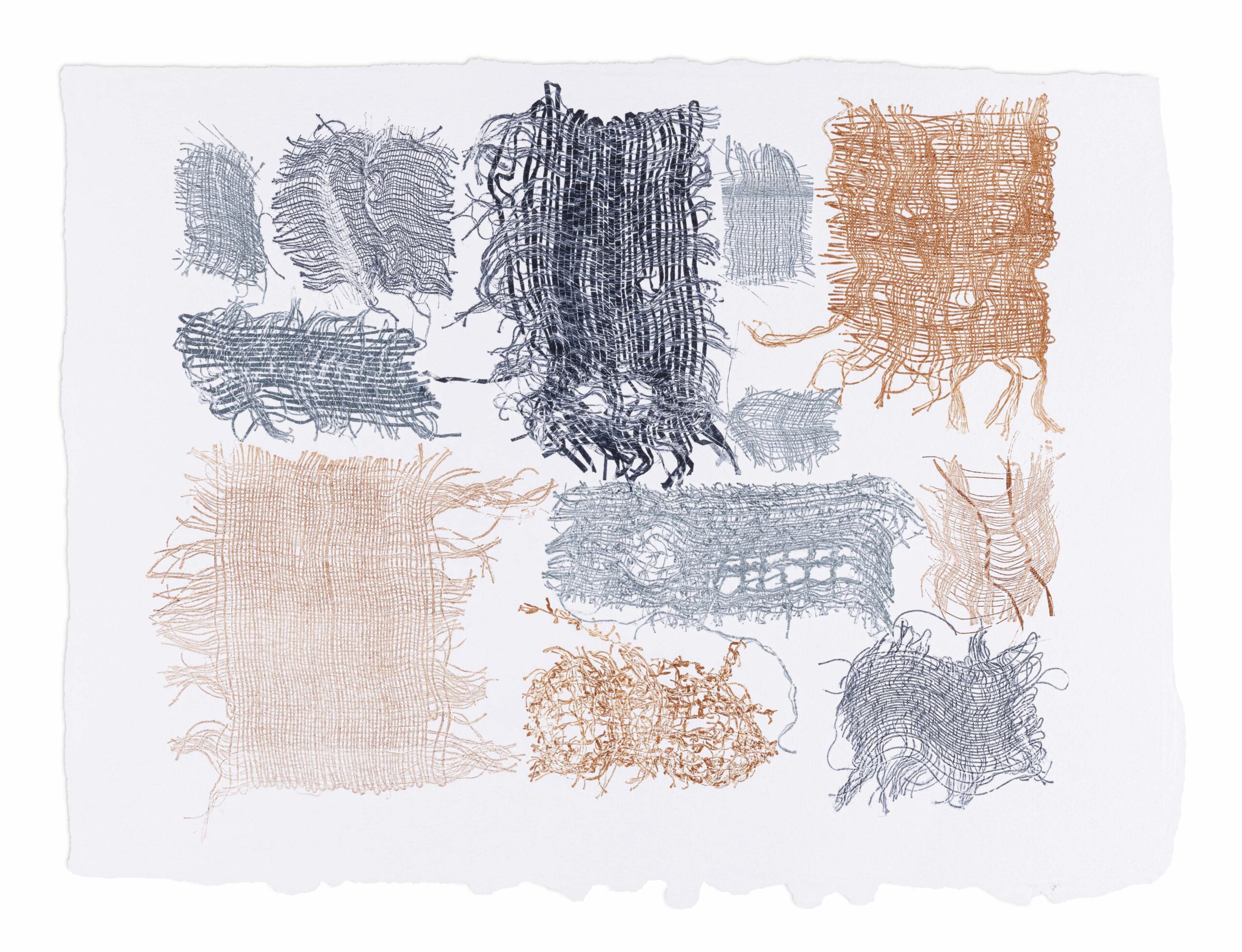 Indigo, grey ochre, maya grey-blue indigo and red ochre on Saint-Armand paper made from abaca and cotton fibres. 22 x 30 inches