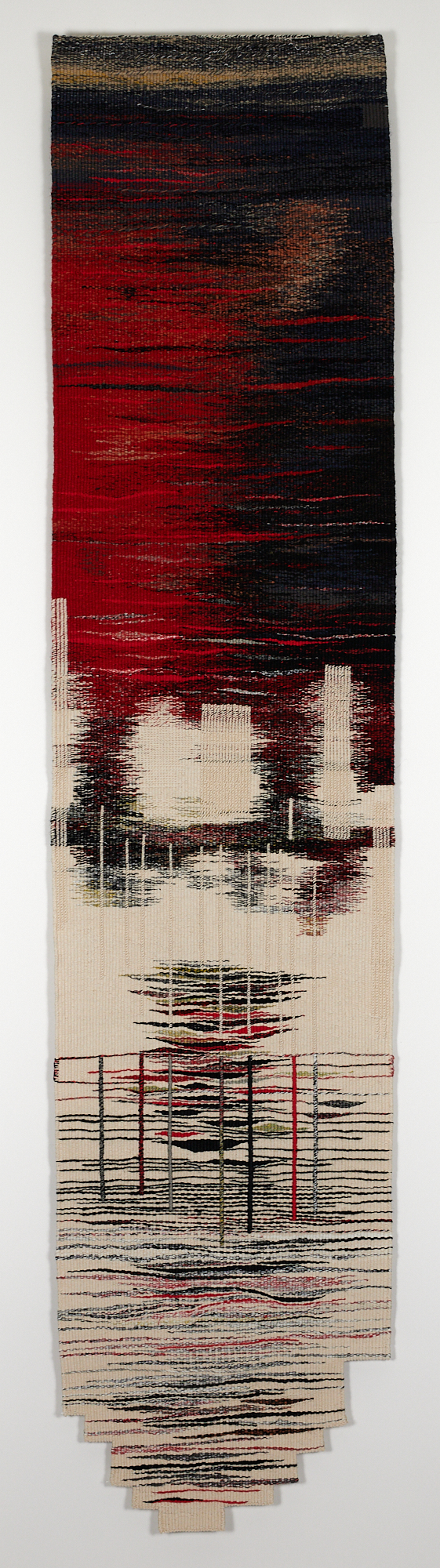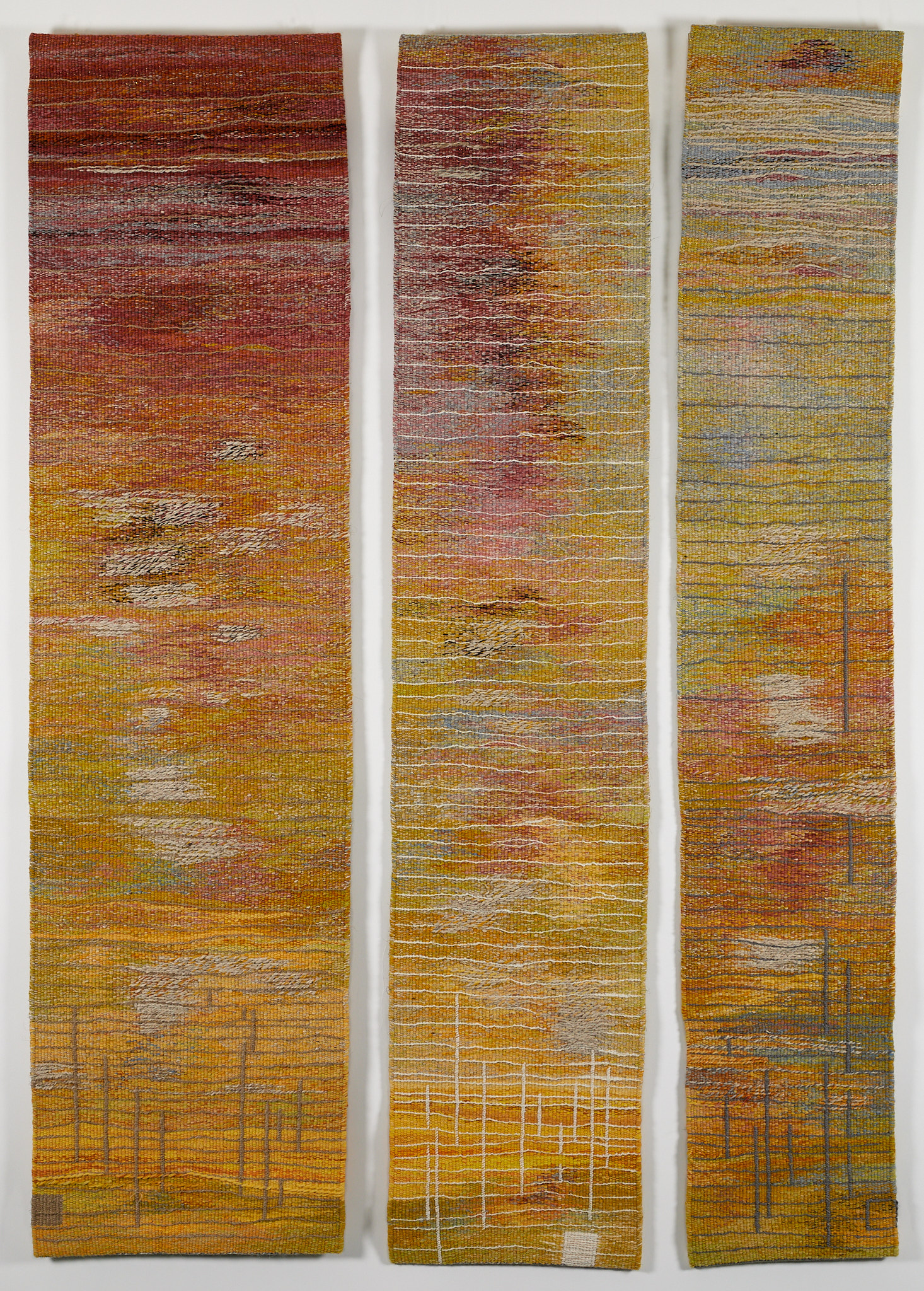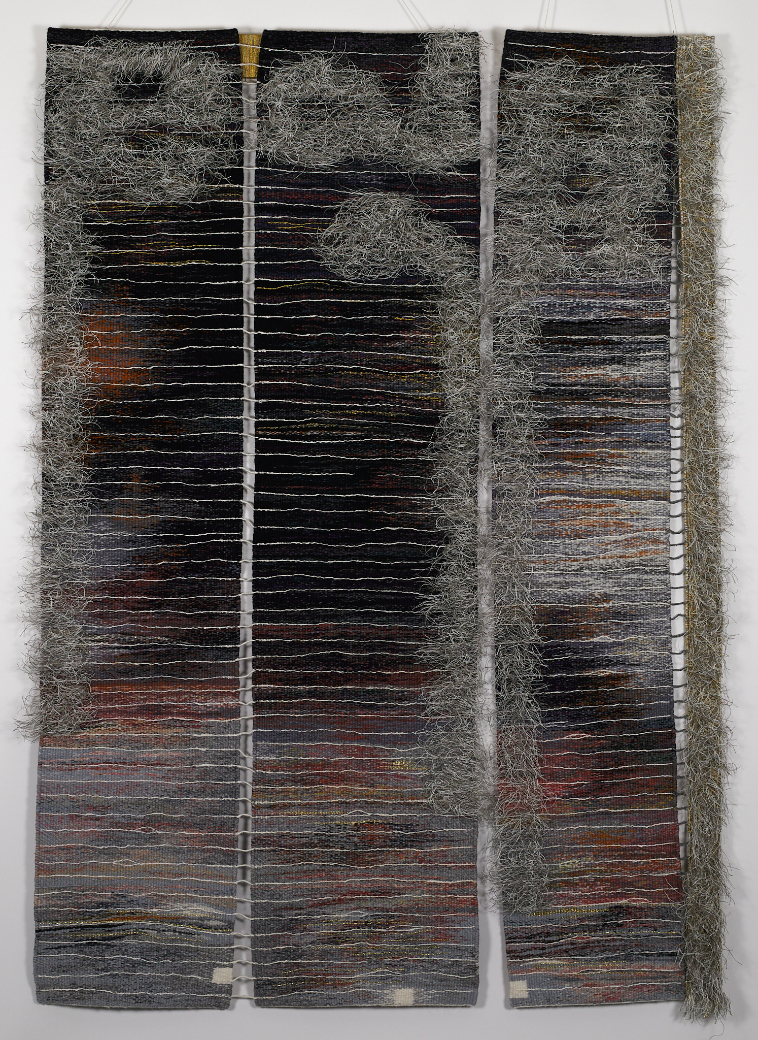Wool, Linen, Metallic Thread, Cotton Hand-Woven Tapestry, Three Panels, approximately 42” x 60", (from the left: 15” x 60", 12” x 60”, 10” x 60")