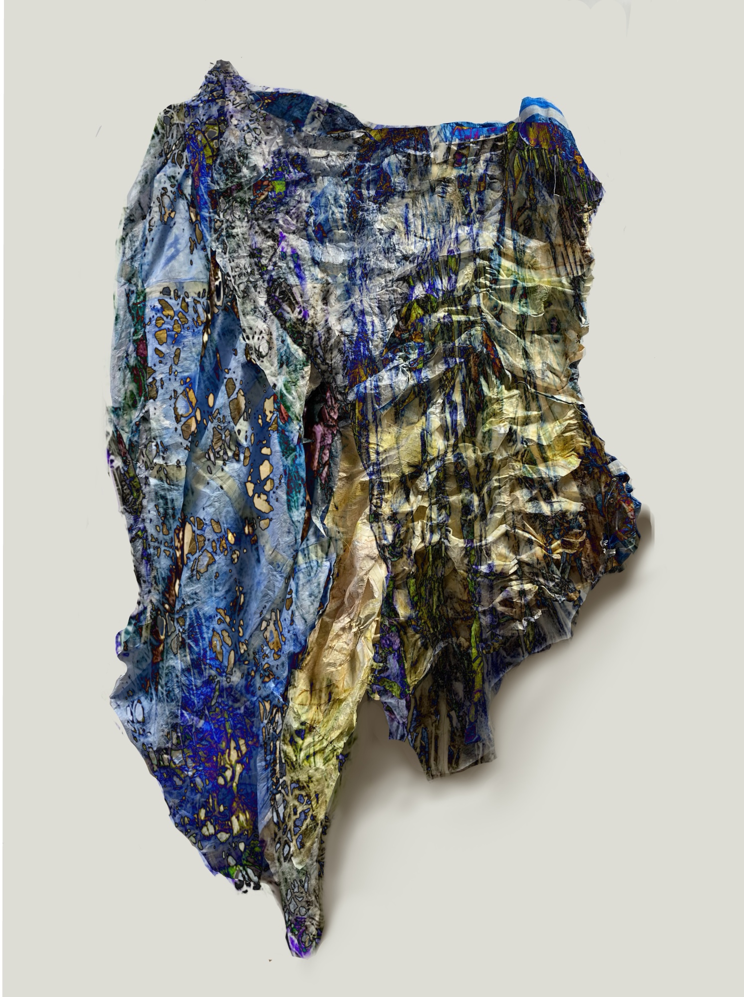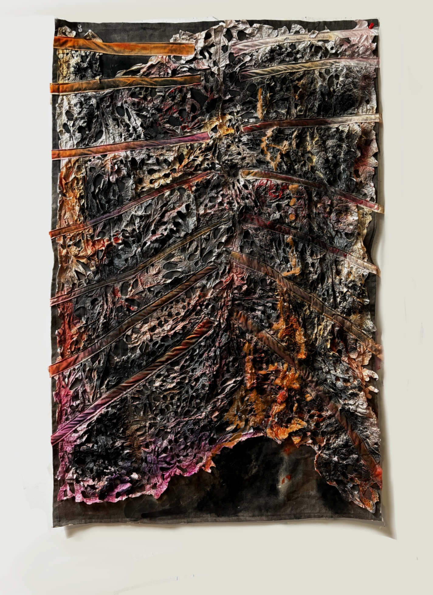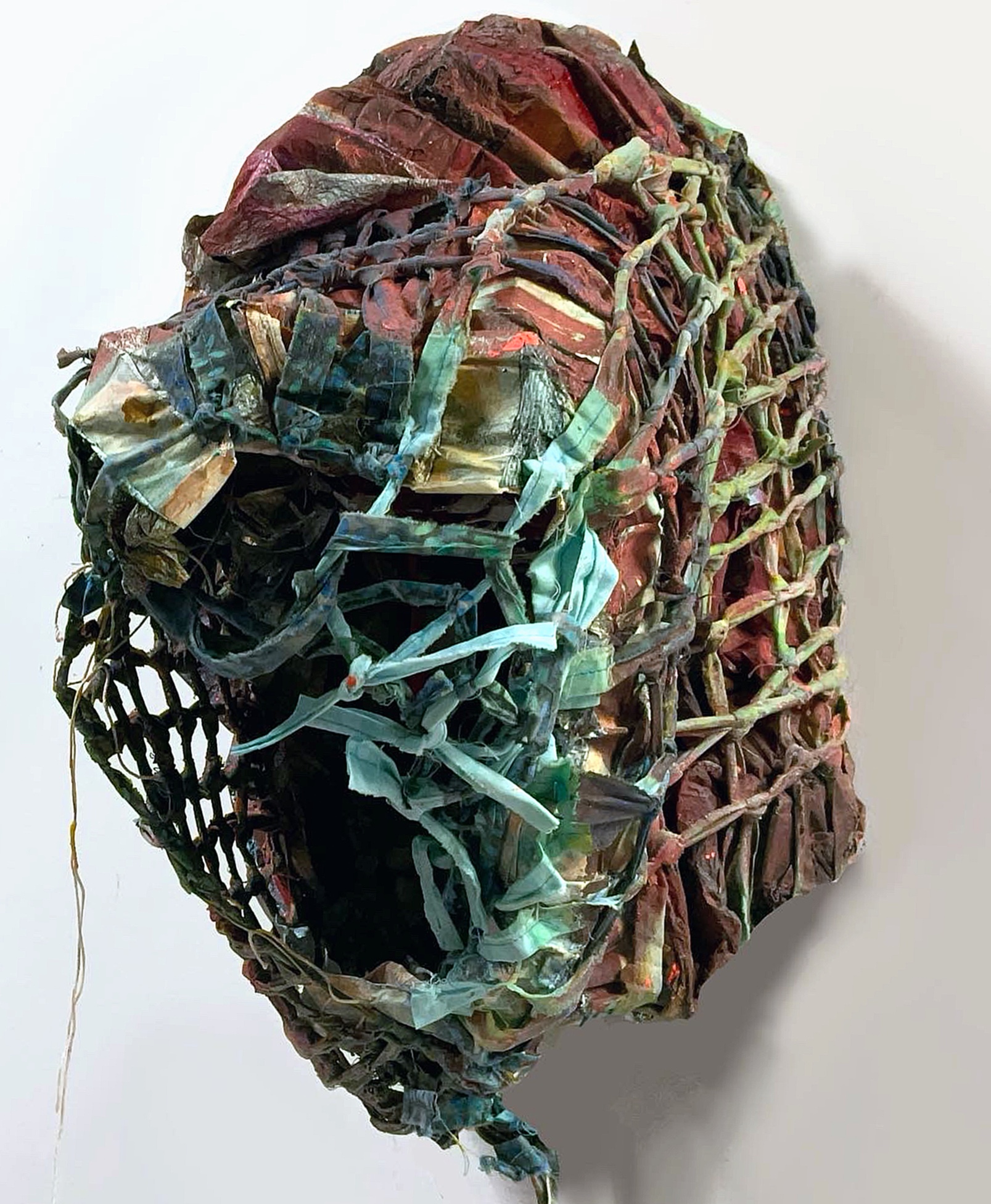 Tyvek, threads, canvas and acrylic paints 50” x 28”