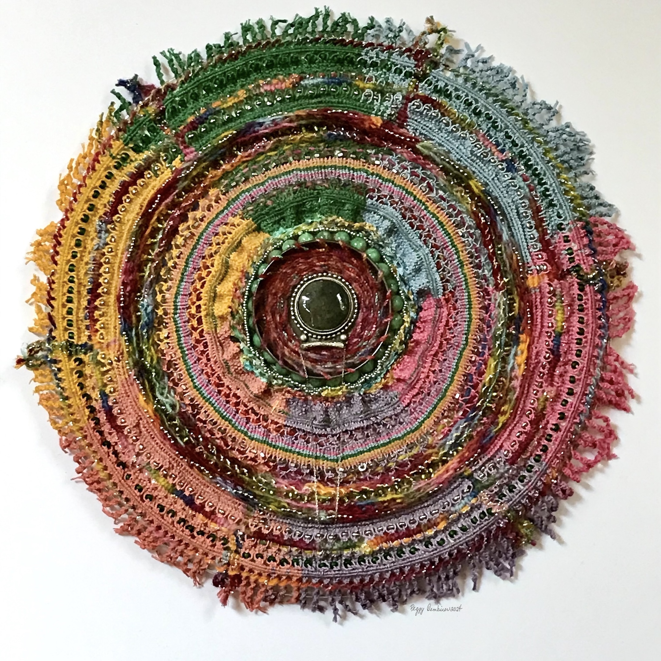Waxed linen, novelty yarns, beads, metal, chains and jewelry findings on recycled drum head. 18" x 18", 13.5" diameter