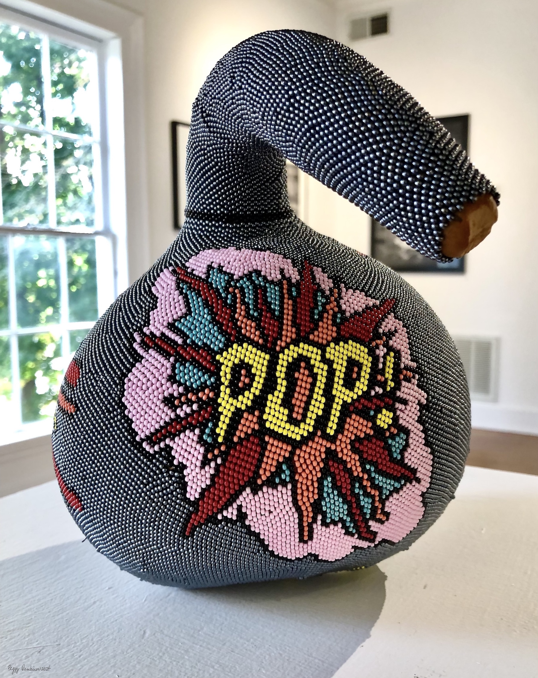 360 degrees beaded found object sculpture paying homage to pop art with words "pop" "bang" "pow"