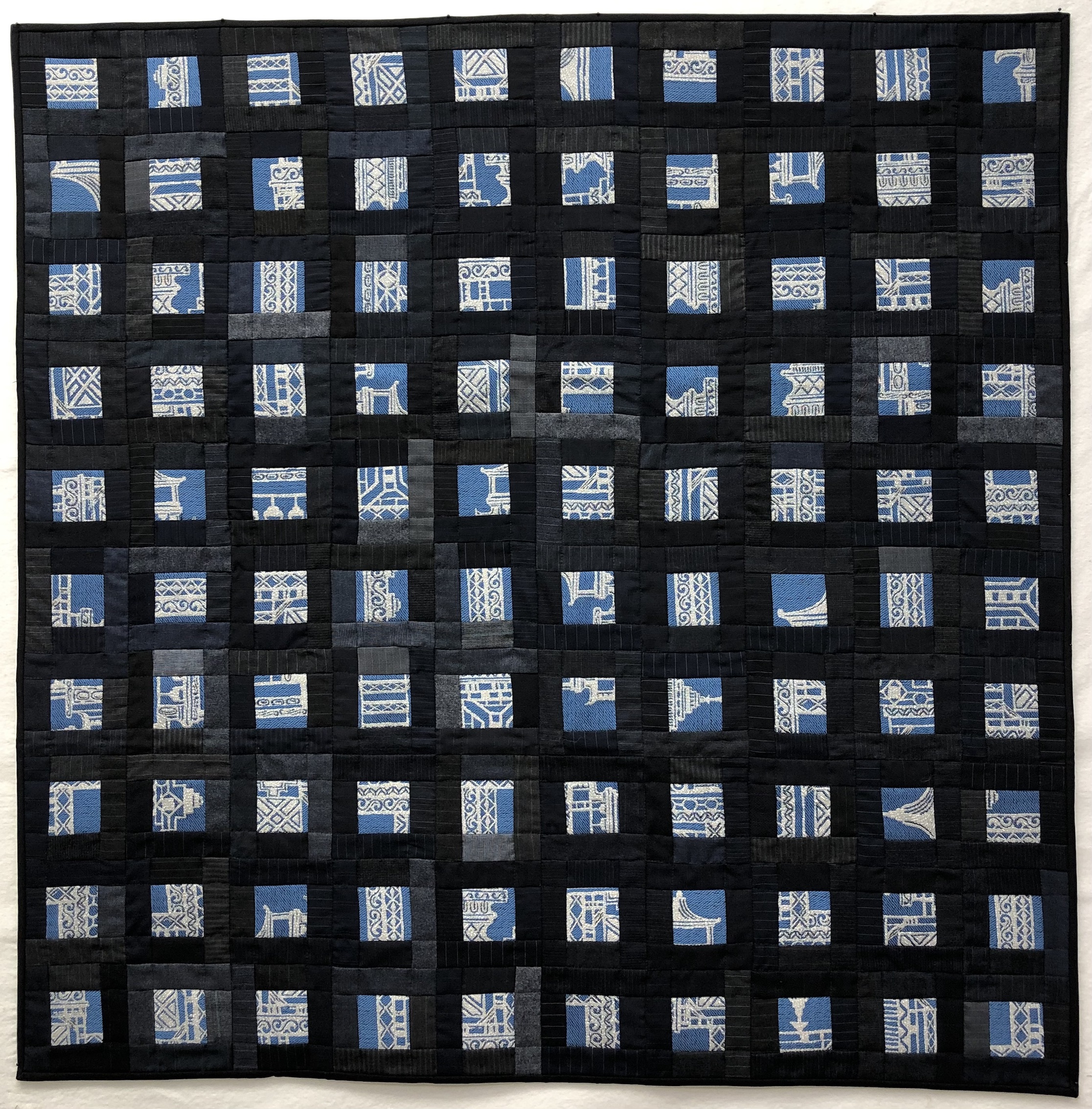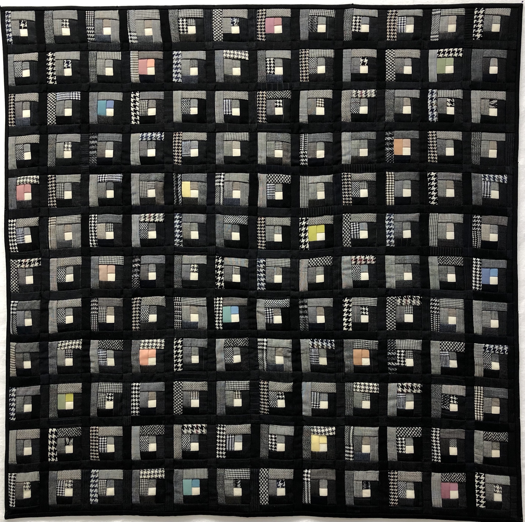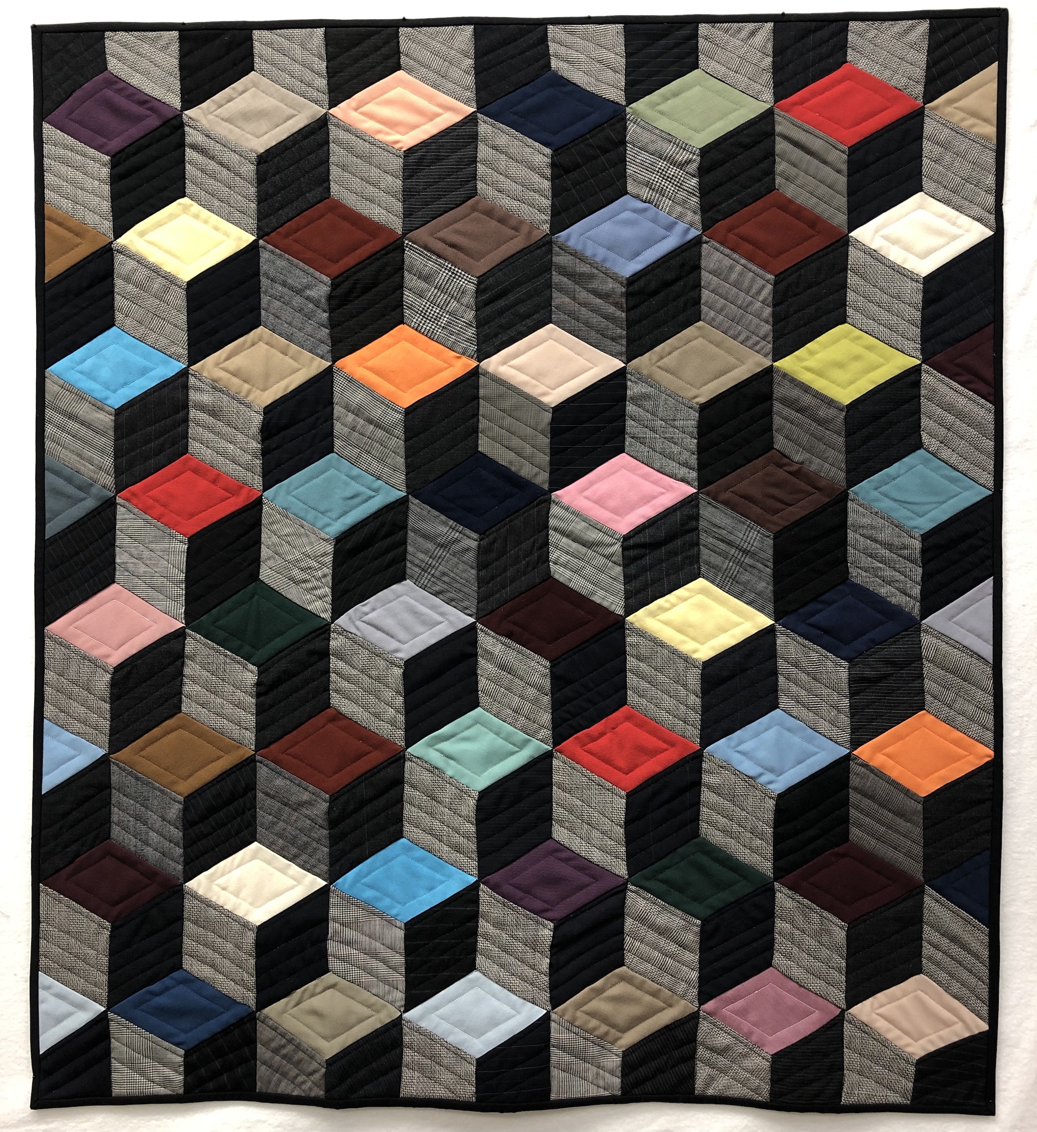 The WoolWorks series developed out of a gift of wool swatches for men’s suits from the tailor shop of Sherman Ray, a Holocaust survivor, who settled in Tulsa after the war. The limitations imposed by the color, hand, and design of the fabrics shifted my usual aesthetic from bright florals and Civil War reproduction fabrics to a subdued palette more appropriate to Amish and Mennonite quilts. Learning to adjust my practice was a big part of the challenge of this series.