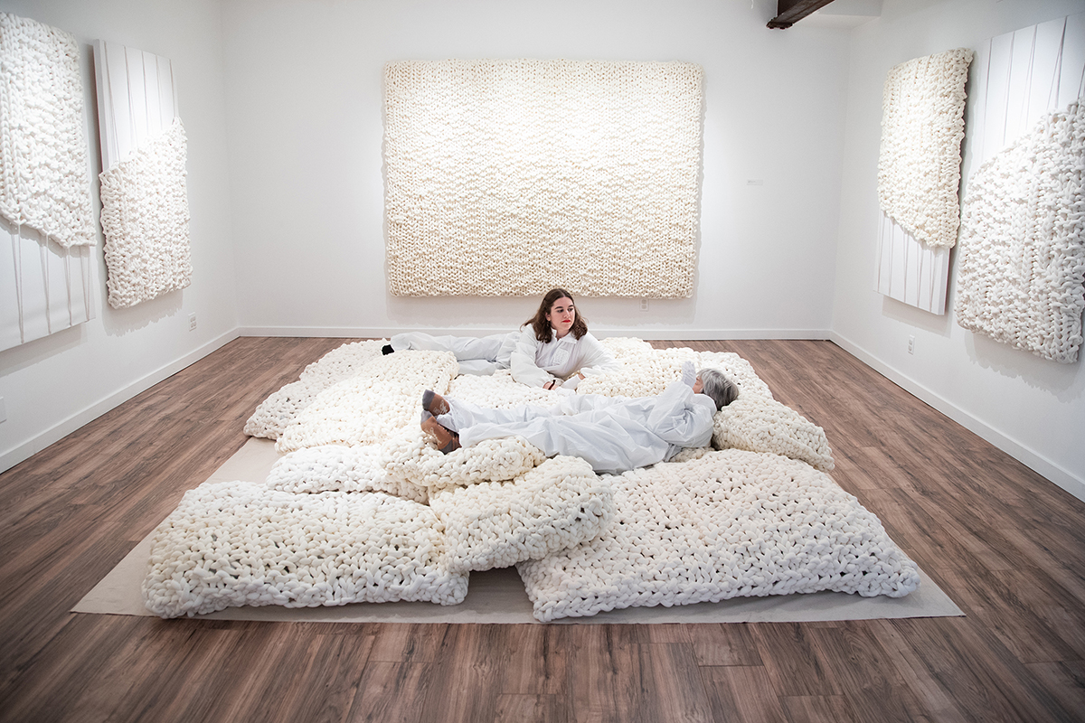 “Non-Binary Code,” my exhibition about gender identity and coded meaning, featured several wall hangings and an interactive installation. Viewers were invited to wear gender neutralizing body suits and lounge in an array of pillows. These pillows were made using a knitting pattern I derived from translating the word “non-binary” into binary code, using knits for 1s and purls for 0s. The resulting textiles are a meditation on non-binary identity, and the installation is an invitation to a space where people can feel comfortable talking about gender while centering the idea of the non-binary. These pillows and wall pieces were made of acrylic yarn and placed on canvas—making these a works of acrylic on canvas, blurring distinctions between the binary of art and craft. Simultaneously a queering of hierarchies, and a meditation on gender, the work lets the viewer experience joy and repose, while lounging, mingling, or reflecting on the work.