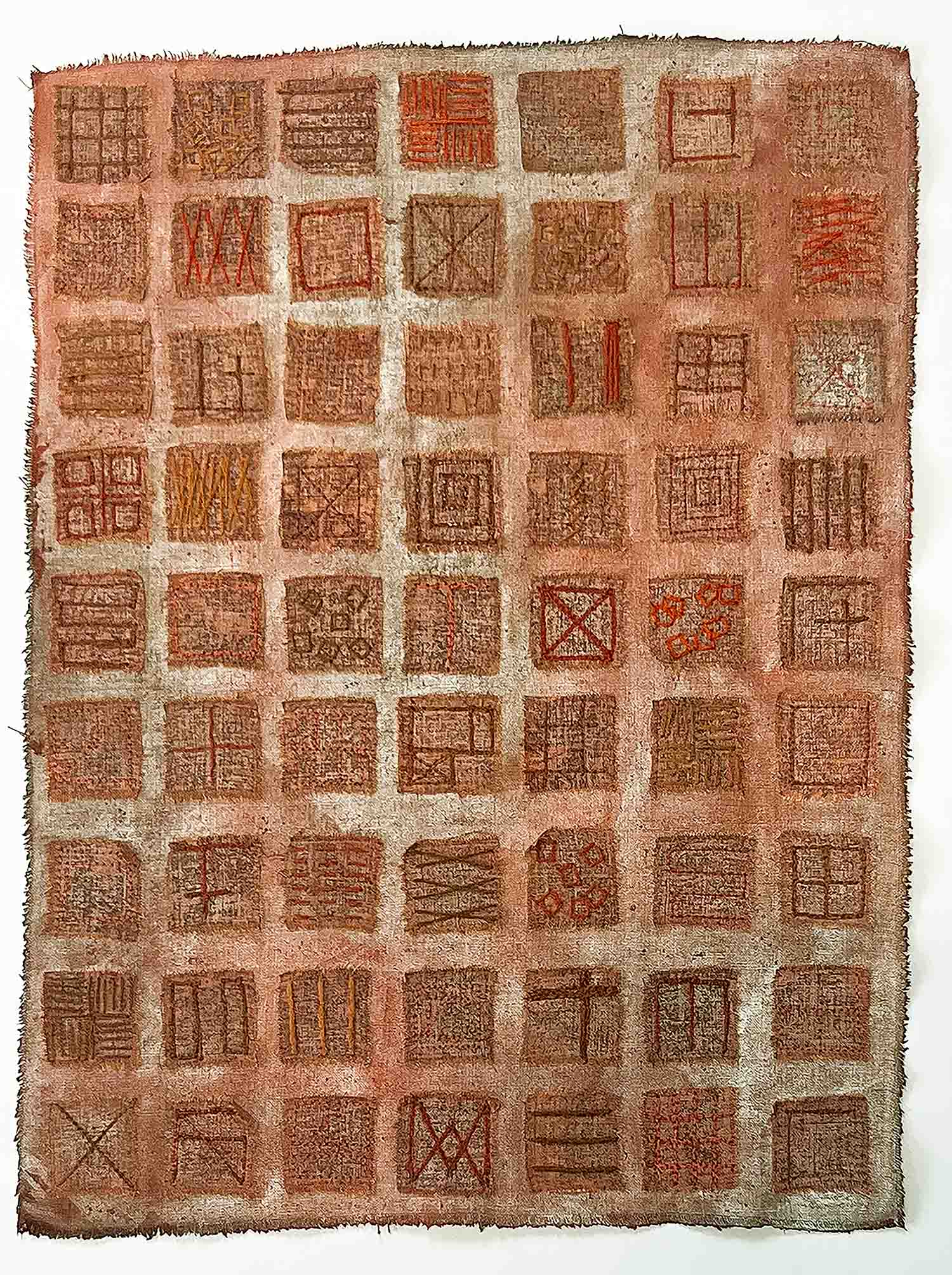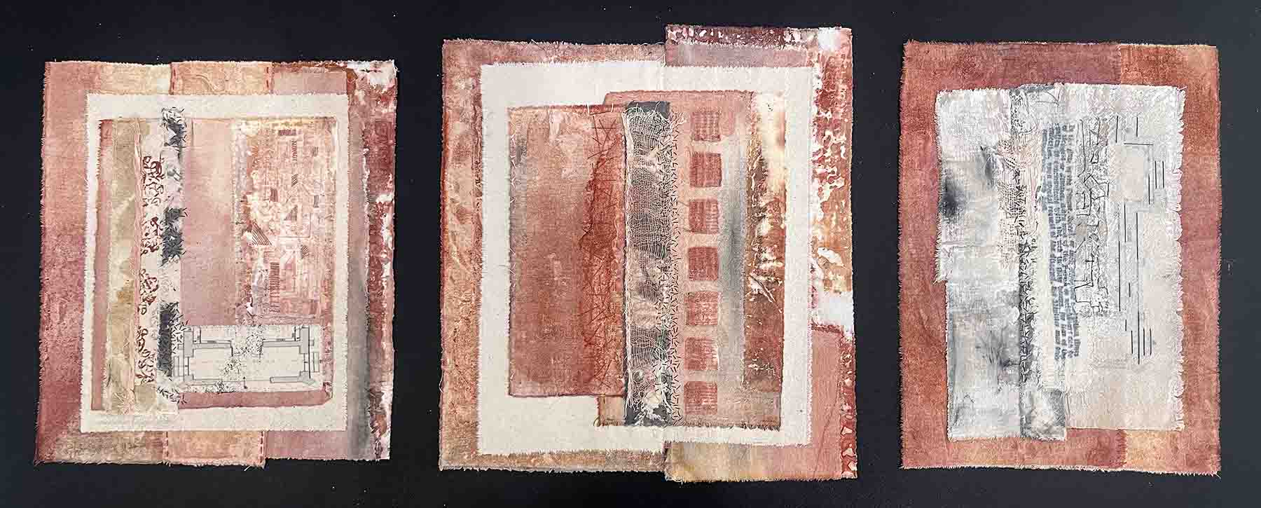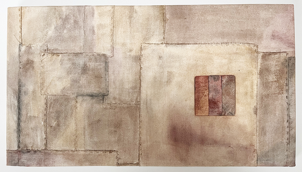 Calico, tissue paper, wax, earth pigment, silk and cotton threads 38cm x 90cm
