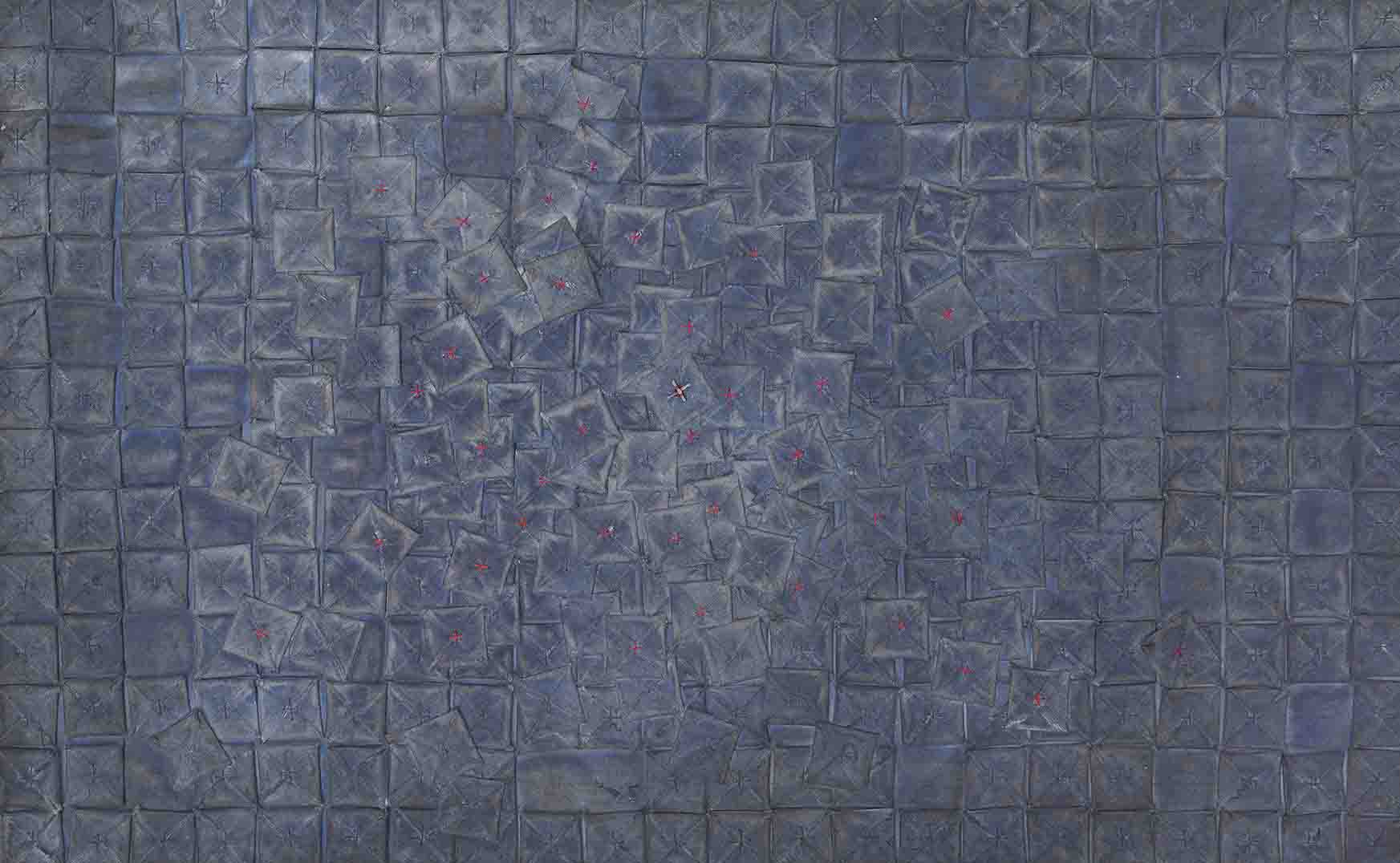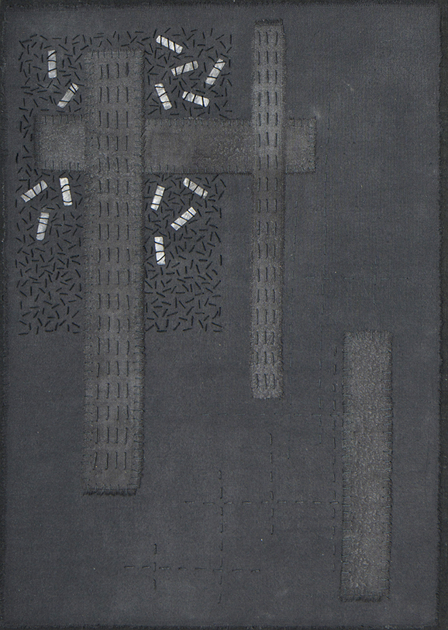 Bedsheet fabric, paint, silk thread, lead foil 32cm x 23cm