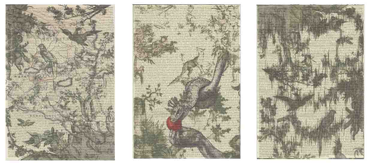 According to the Book of Genesis, Adam and Eve, tempted by the serpent, ate fruit from the tree of the Knowledge of Good and Evil and were banished from Eden. Drawing on imagery from traditional Toile de Jouy prints of an idyllic countryside, this work explores three moments in the story: before the serpent tempted Eve; the moment of temptation and the loss of Paradise. All three parts of the triptych have been layered with an excerpt from John Milton’s seminal work ‘Paradise Lost’. This section of his work on The Fall, published in 1667, deals specifically with how the banishment from the Garden of Eden and loss of Paradise came about and describes its consequences for the future of man and of women.