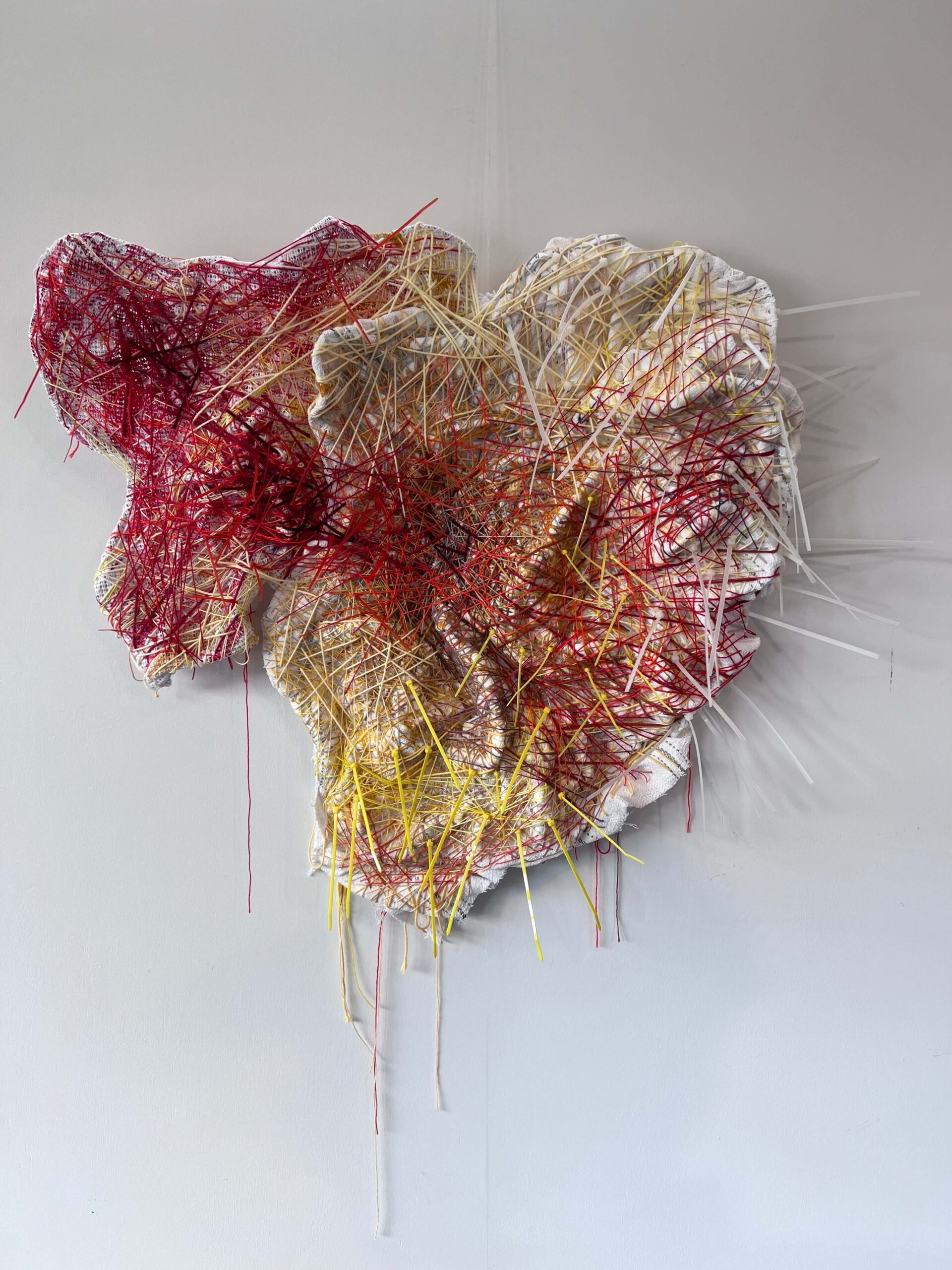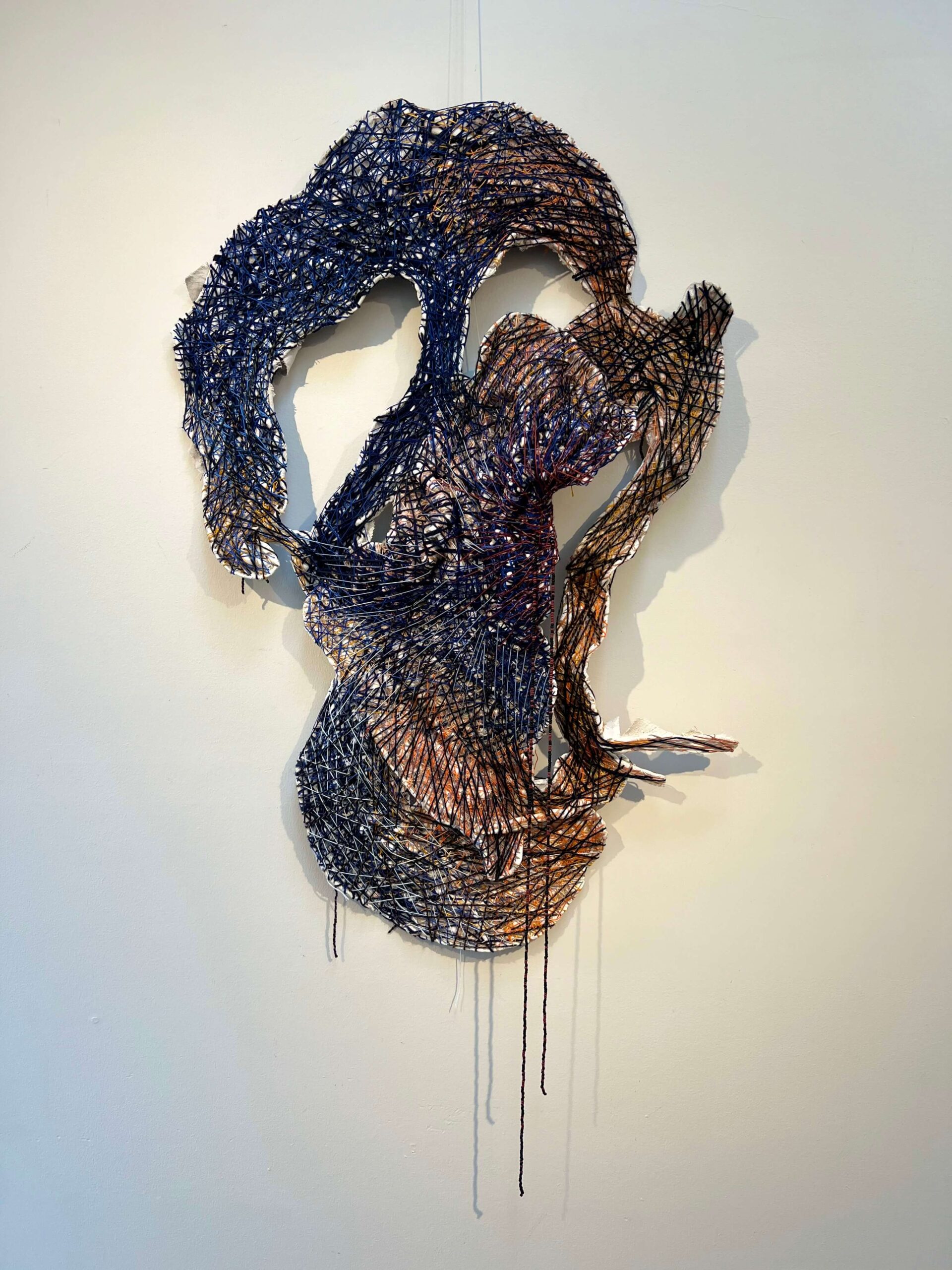 Plaster, cotton and silk embroidery fiber, yarn, waxed cord, zip ties, repurposed textiles, steel wire frame. 46X32X1.5 inches
