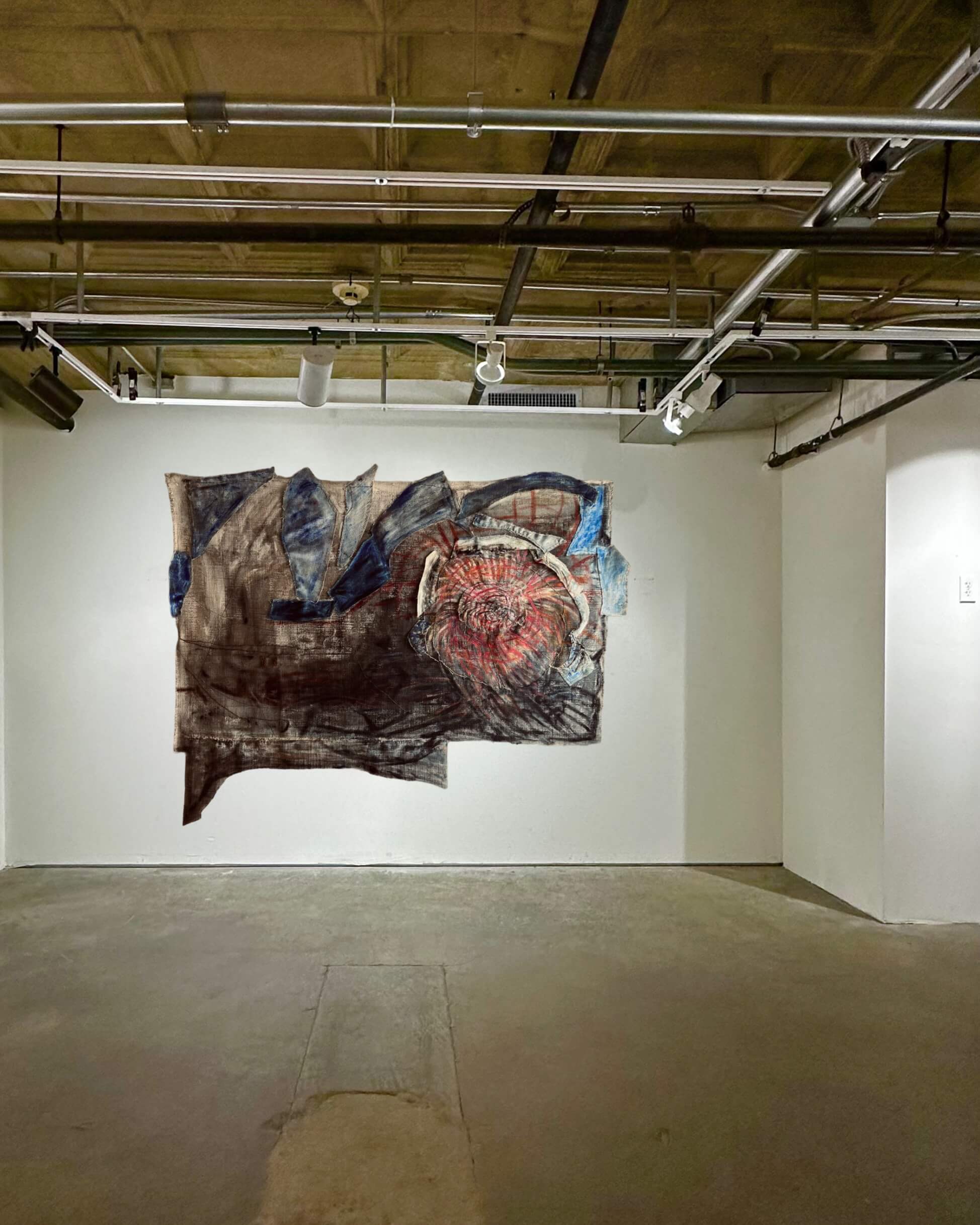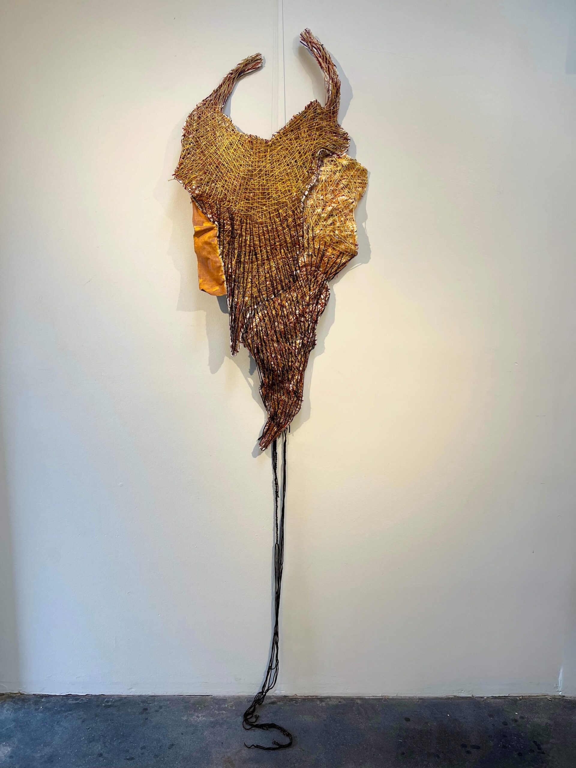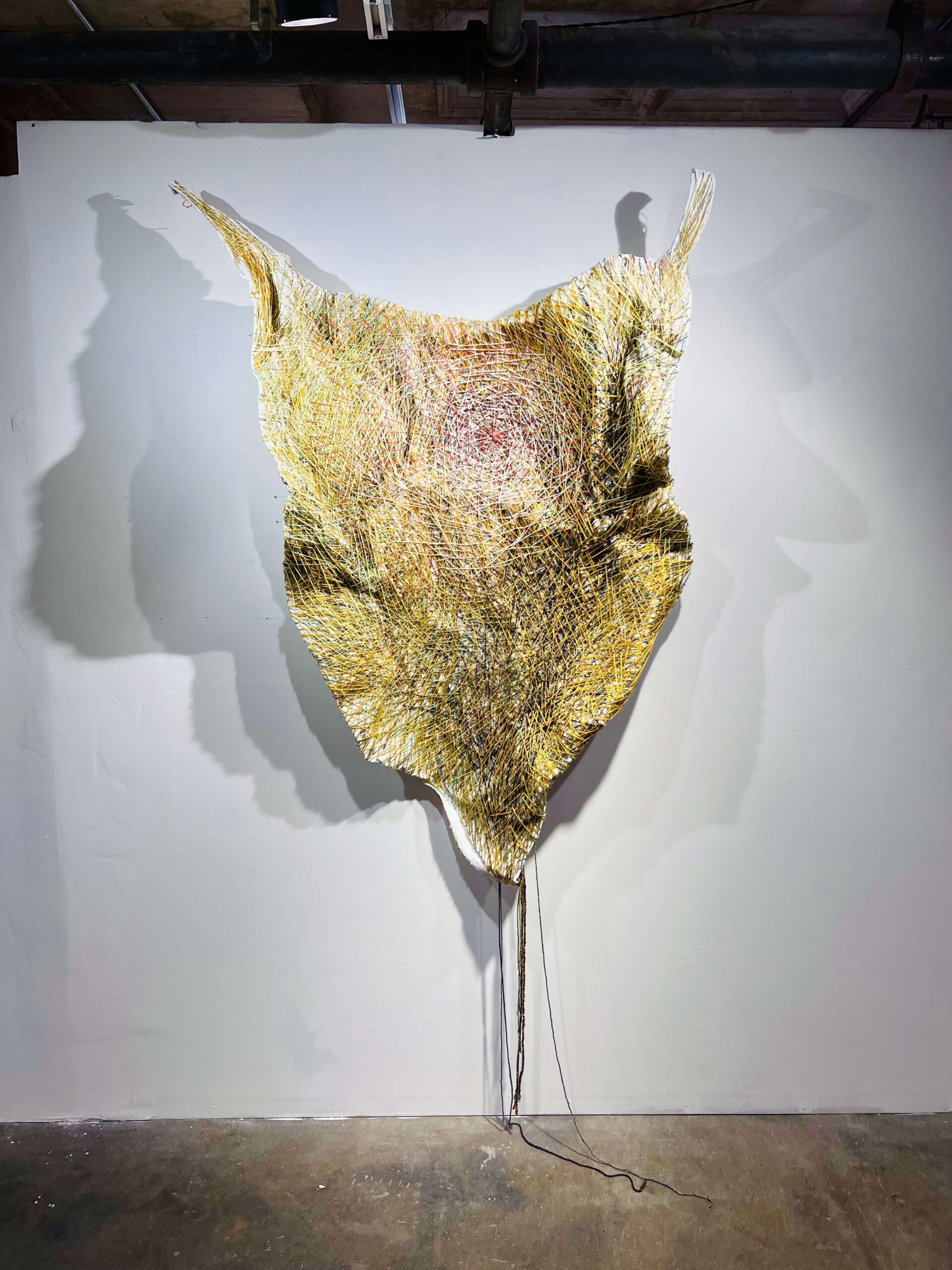 Steel wire frame, Plaster, Cotton and silk embroidery fiber, waxed cord on repurposed textiles. 70X46X3 inches