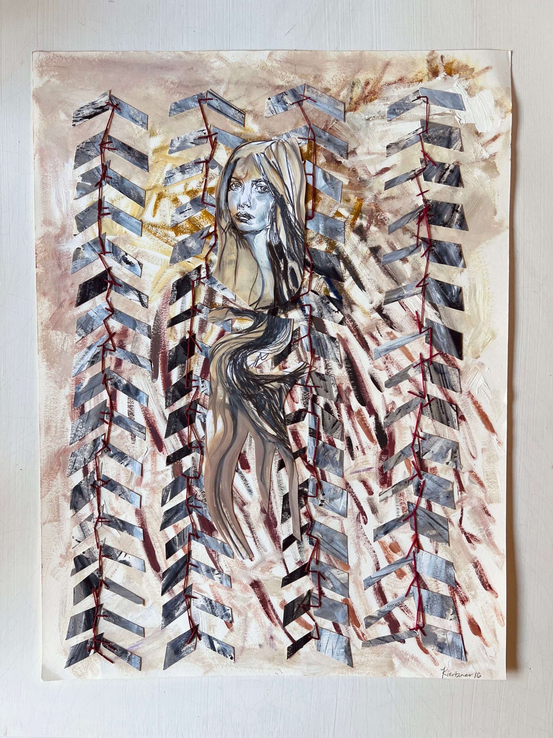 Oil on paper, embroidery fiber, quilted. 24X16 inches