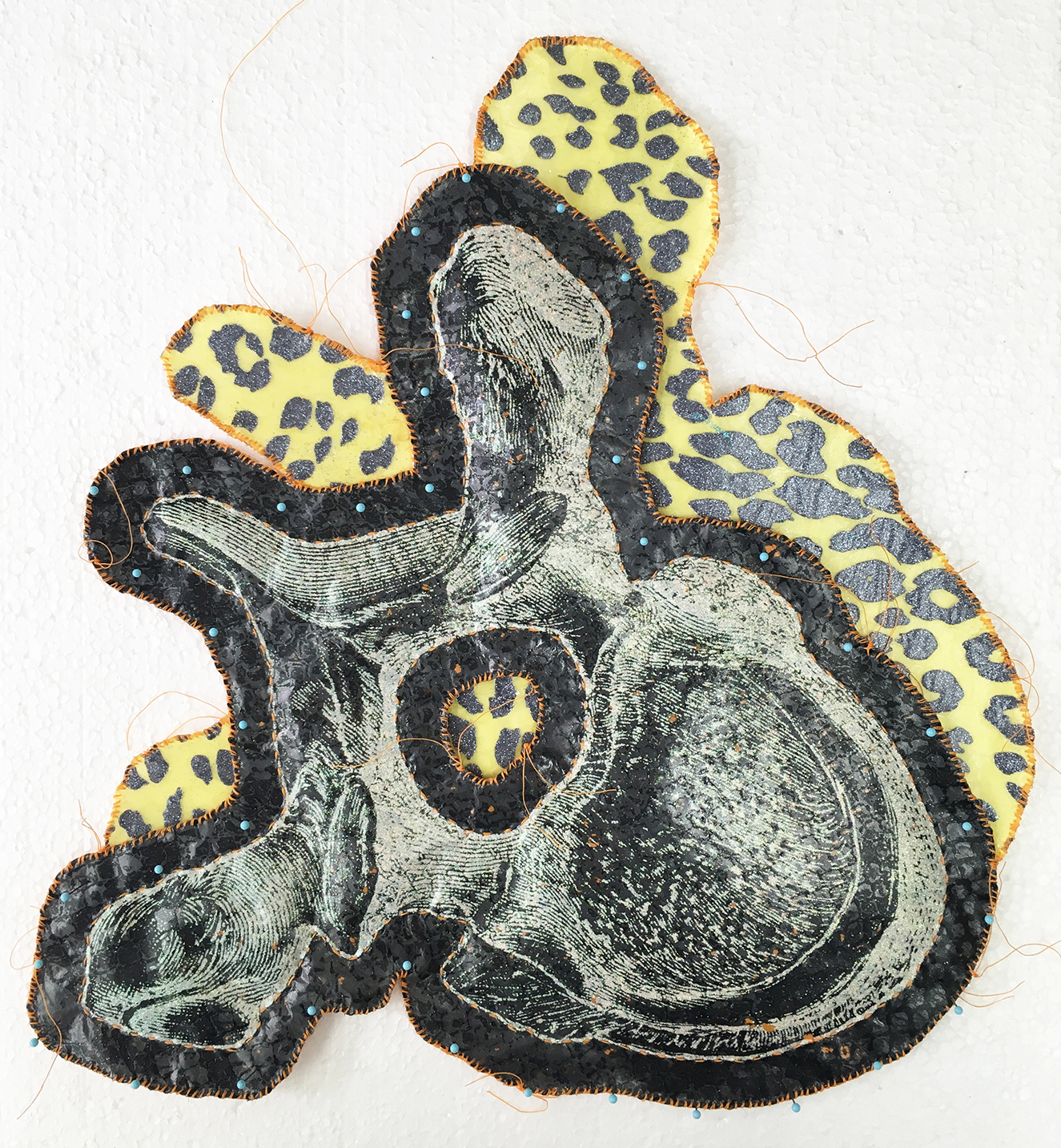 Hand sewn heat pressed plastics; embellished with screen-printing, glitter, pins and thread. 35 x 50cm