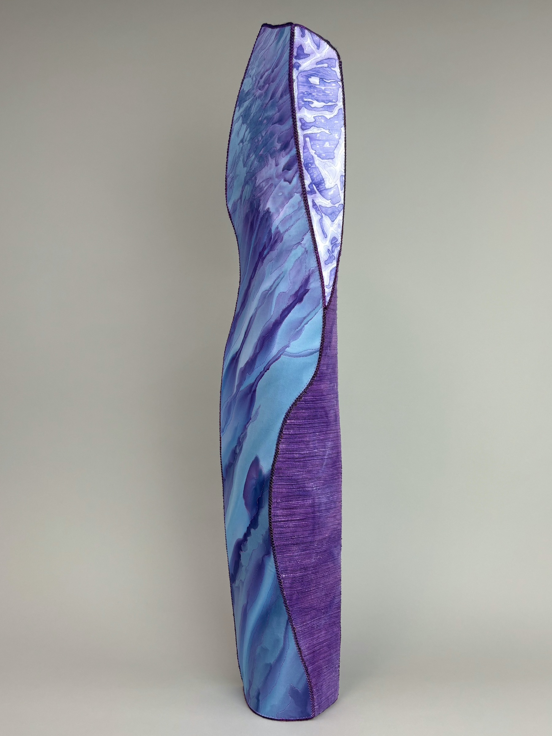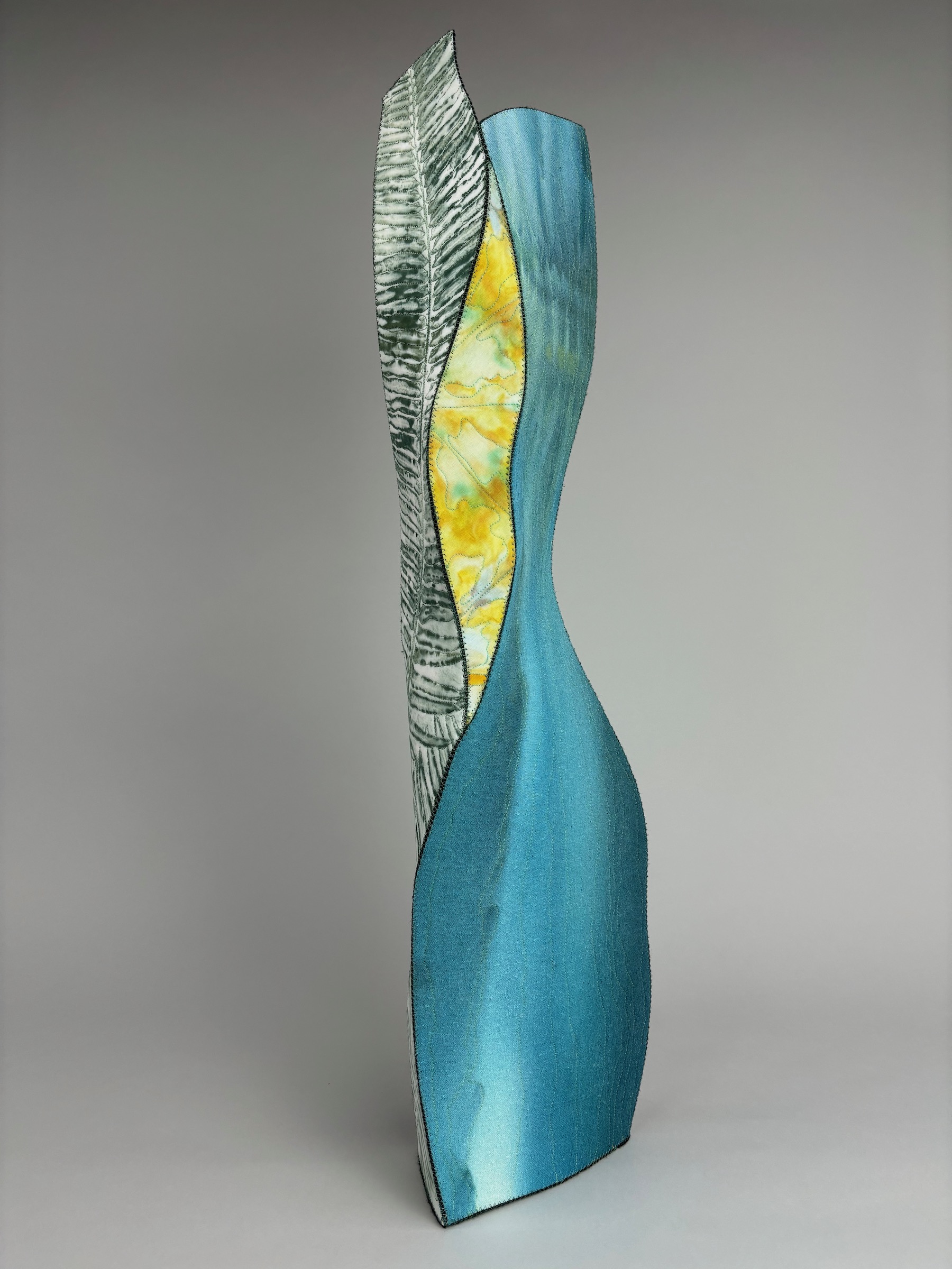 The sculptures in this series are named for glaciers in Washington State, a memorial to their disappearing. These forms break into three-dimensions, their fabrics dyed using methods of ice dyeing, folding, binding, and printing. Monotypes of sword and bracken ferns, native plants that are survivors of drought and tough conditions, frozen in time with dye on fabric. They are dynamic documents of change over time, sped up in the dye studio. In each artwork stitch is structural and integral. It adds emphasis and embellishment, provides depth and pattern, and connects the fabrication to its traditional uses.