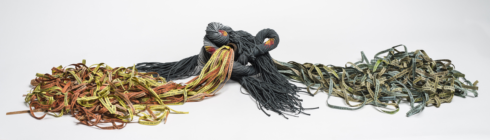 Painted rope, canvas, paper, digital text on silk and organdy fabric, gold thread, beads Wall piece: 87"H x 65"W x 6"D Sculpture: 15.5"H x 30"W x 24"D