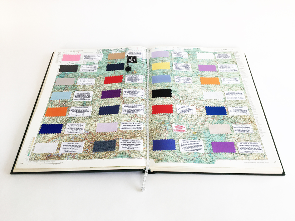 Vintage atlas, textile, silk threads, fabric from donated kuppels. Hand stitch 56cm x 38cm x 7cm
