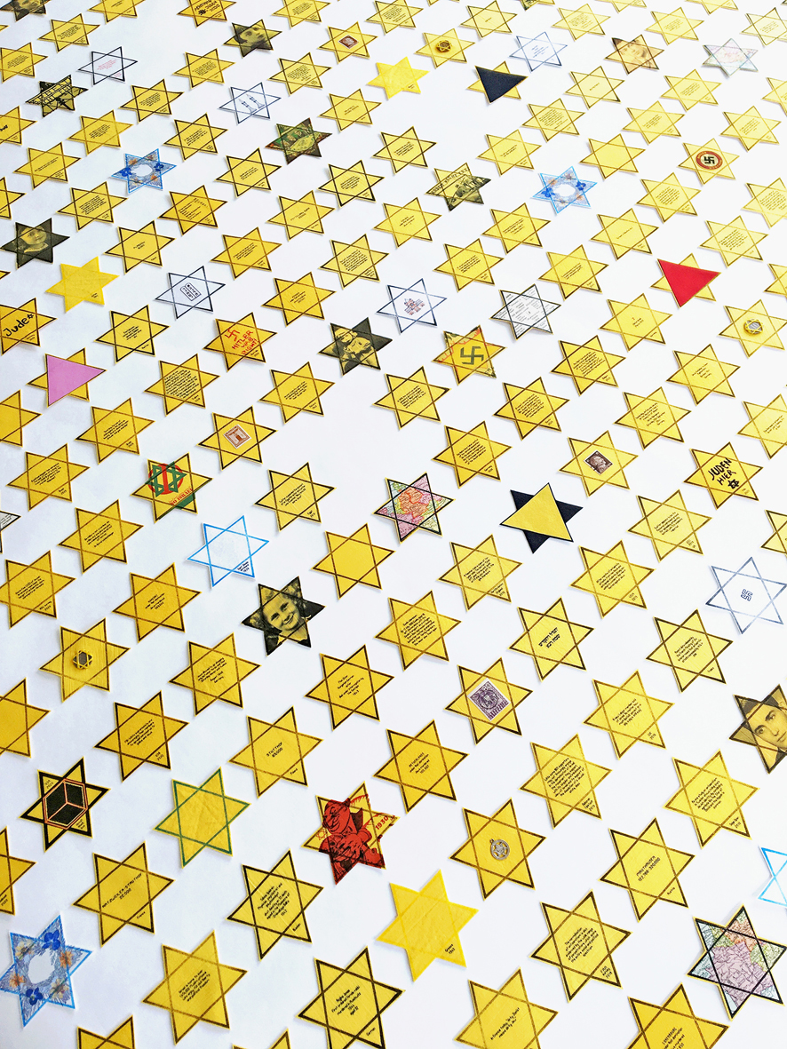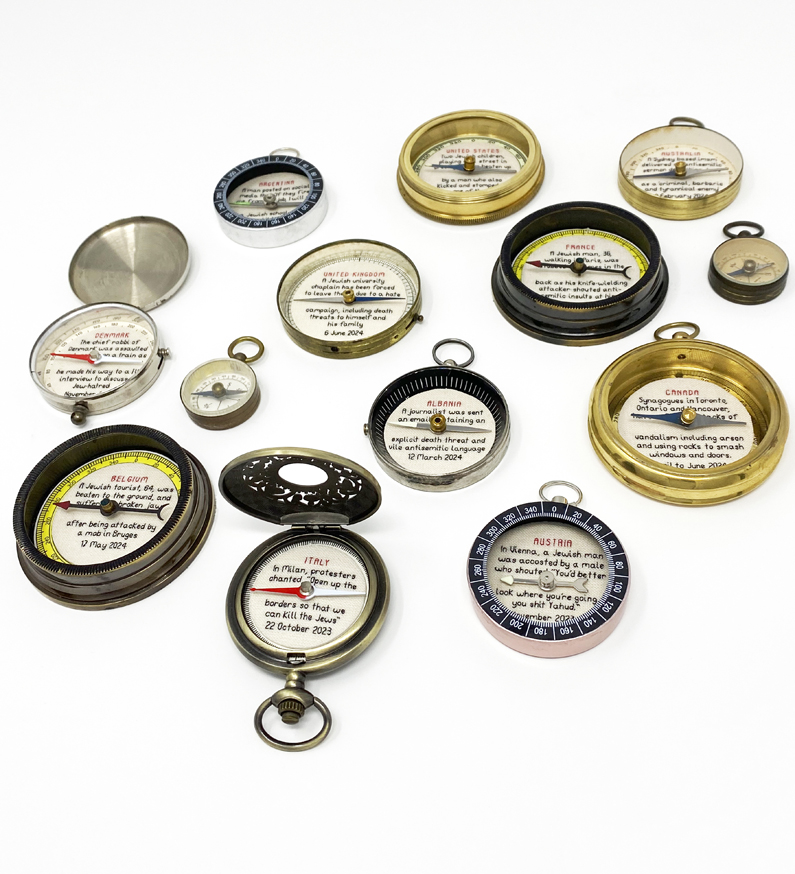 ‘Moral Compass’ addresses the unprecedented resurgence of antisemitism since the Holocaust, focusing on attacks against Jewish people in public spaces, places of worship, workplaces, on holiday, and through social media. The piece highlights incidents occurring globally today. It questions whether society has lost its moral compass where respect for individual identity and heritage coexists with the normalisation of antisemitism.