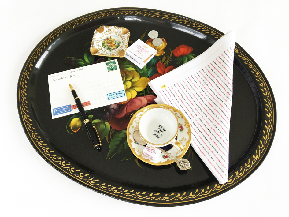 Antique porcelain cup & saucer, vintage ashtray, spoon, postcard, fountain pen, coins (all origin Germany), vintage serving tray from Russia, textile, silk threads. Hand stitch 51cm x 41cm x 6cm
