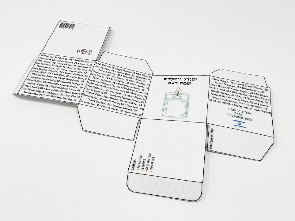 On the morning of 7 October 2023, Hamas terrorists carried out a massacre at Kibbutz Be’eri, killing and abducting residents. A total of 101 Israeli civilians were murdered, including peace activists, children and one infant. Additionally, 32 hostages were taken. Mourning Light has been created in the form of a flattened box, reflecting the style of boxes that hold memorial candles traditionally used to honour the memory of those who have passed away. The artwork is hand stitched with the names of those murdered on that day, serving as a devastating memorial to the victims.