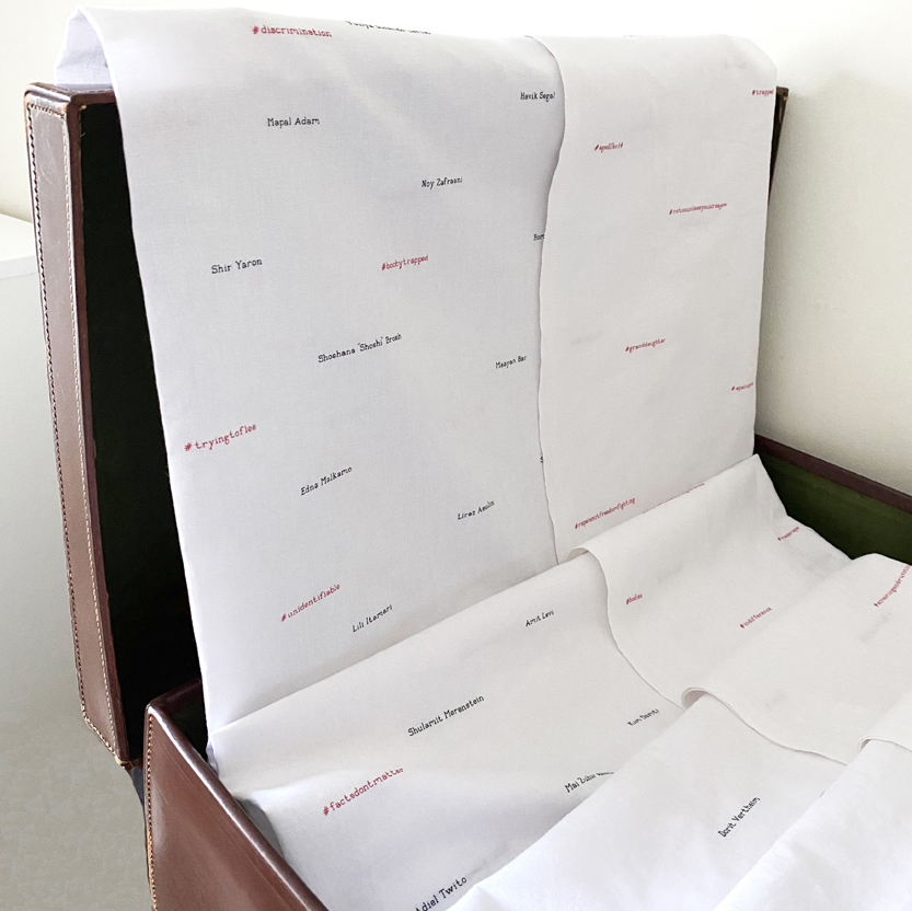 On 7 October 2023, Israeli women were brutally attacked by Hamas terrorists; they were thrown to the ground, raped, sexually mutilated, murdered, and taken hostage. The artist reflects upon the palpable silence of the #MeToo movement and others in the face of such atrocities. In response, she has created a shroud, hand-stitched with victims’ names and hashtagged words, representing the extreme horror of that day. No additional information, such as the victims’ ages, places of residence, or occupations, is provided due to the lack of global interest regarding the brutality of this attack on innocent women and children in Israel.