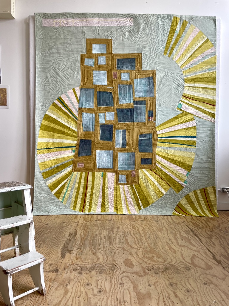 This work is from my "Urban Patchwork" Series, and is inspired by street art in Paris and Florence. Art is everywhere in these cities, in museums, of course, but also on abandoned buildings, in doorways, down alleys, sometimes inserted right into cracks in the sidewalk: urban decay transformed into a mosaic flash of art, right under our feet. Even the most beautiful cities in the world are better for this sneaky street art. The kind of scrappy street art I love, and the abstract textile art that I make, are connected. Patching, making do, and creating art out of humble materials is also what I do. This series is a development of that connection, an exploration of our need for art, where we live, where we work, in the streets, sunk into the pavement at our feet. We need art, we must make it and we must see it, even in intensely urban settings, where the small ring of the human voice strives to be heard over the urban din. And still, happily, the joy of artistic expression persists.