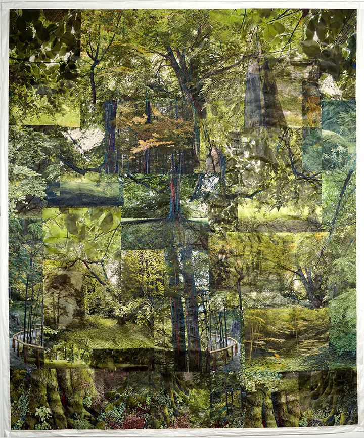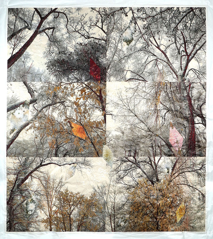 Sewn archival pigment prints on kozo paper, thread, printed silk gauze, lace 61" x 51"