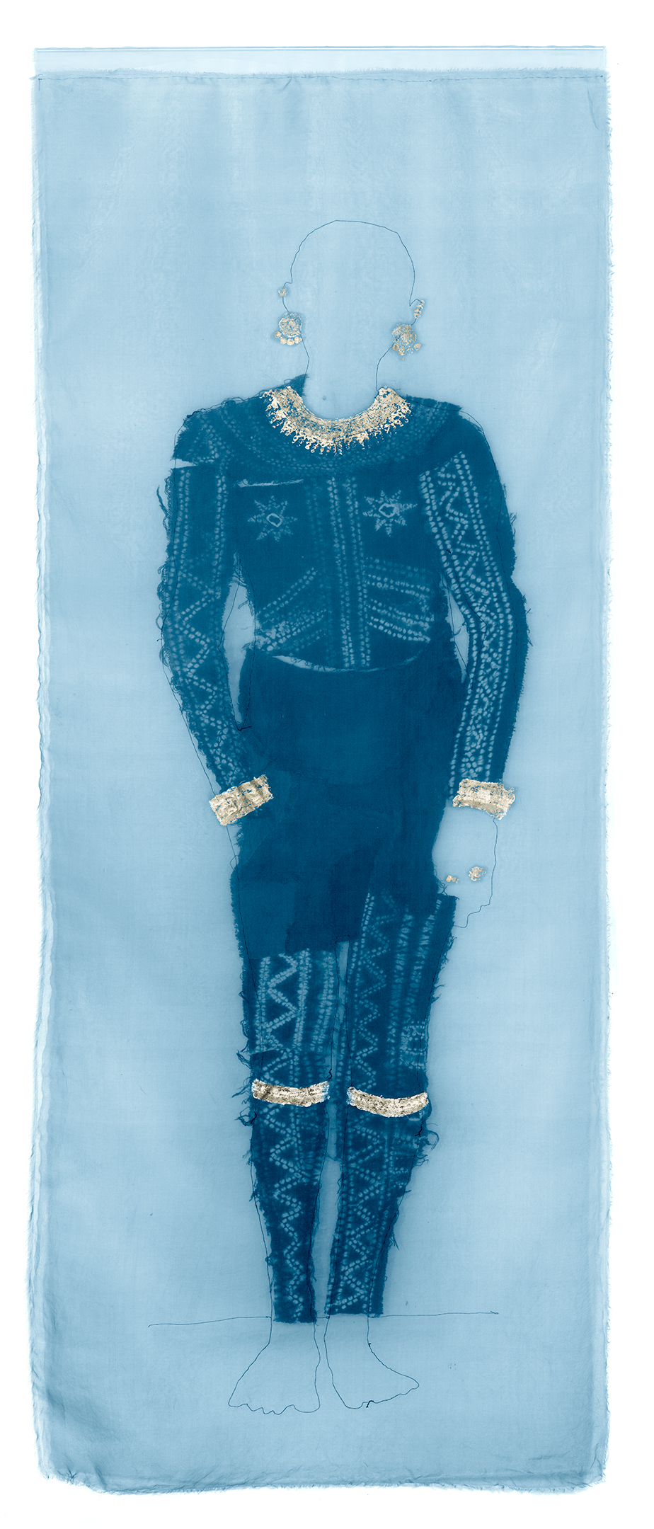 Installation composed of seven overlapping 27” x 72” indigo dyed panels made of silk organza, hand tied and stitched indigo-dyed cotton with hand-sewn thread markings and gold leaf. Each panel is supported by an aluminum rod suspended with microfilament. 14' x 9' x 2'