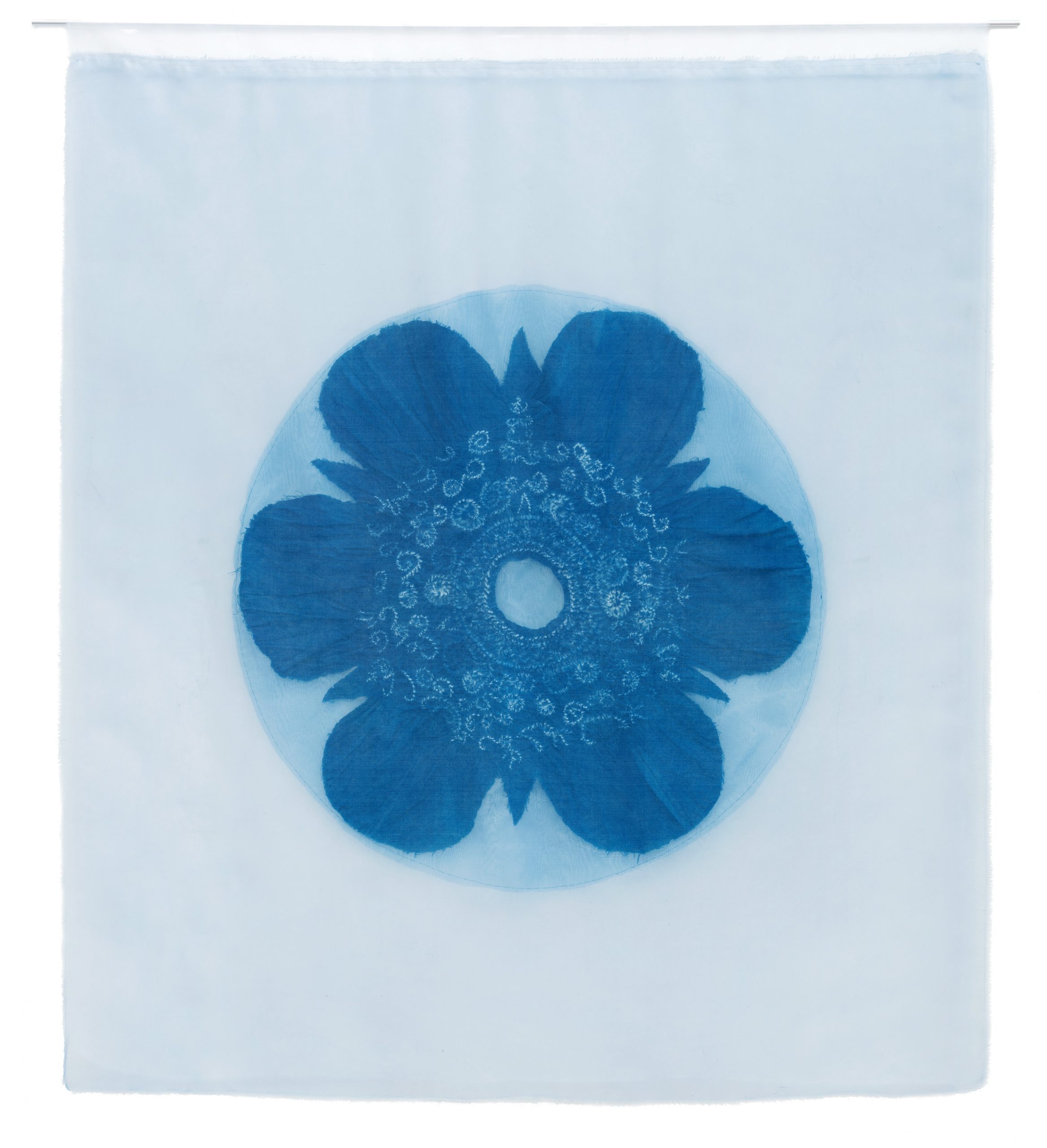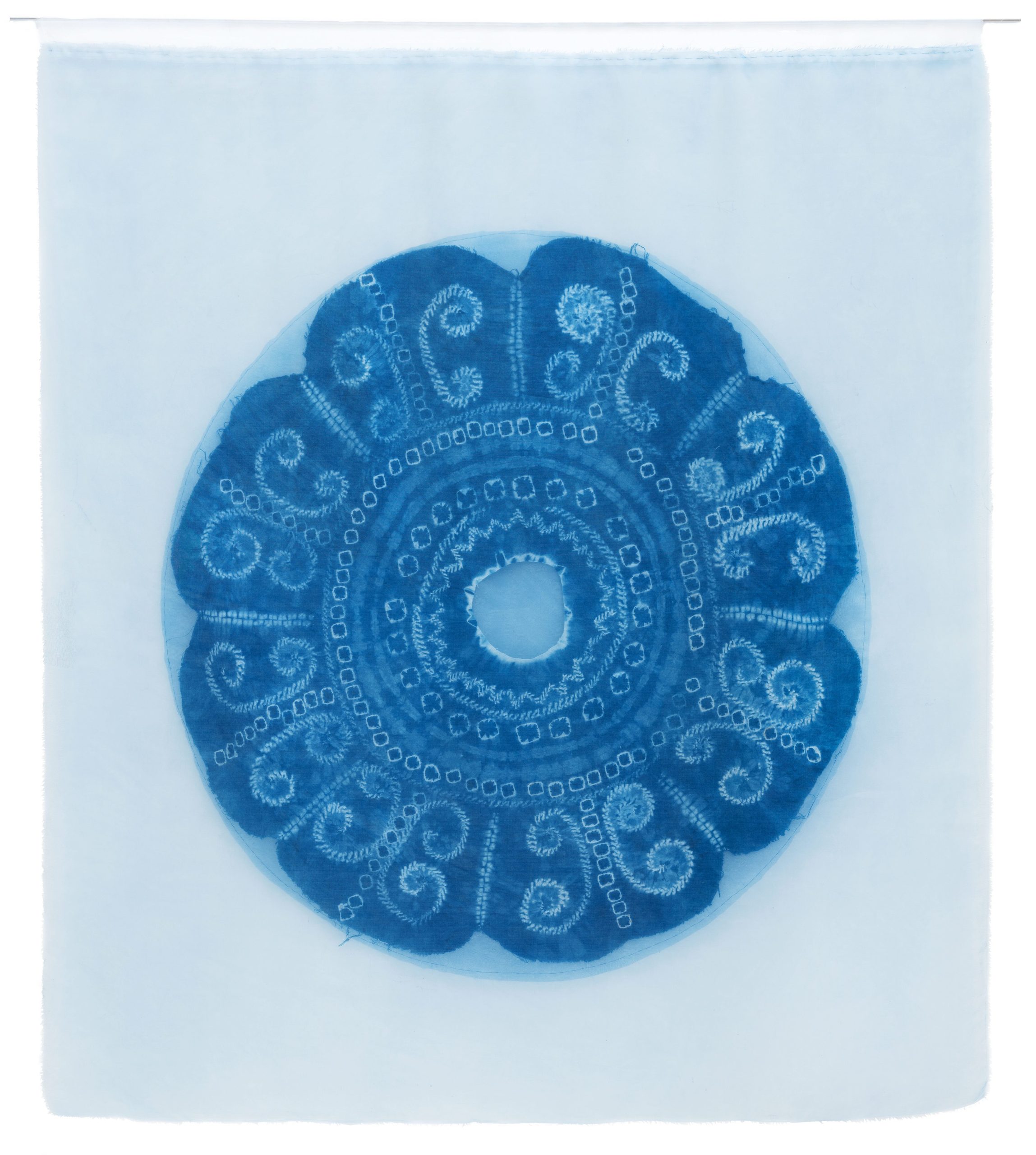 Indigo dyed panel made of silk organza, hand tied and stitched indigo-dyed cotton with hand-sewn thread markings and gold leaf. Each panel is supported by an aluminum rod suspended with microfilament. 50” x 54”