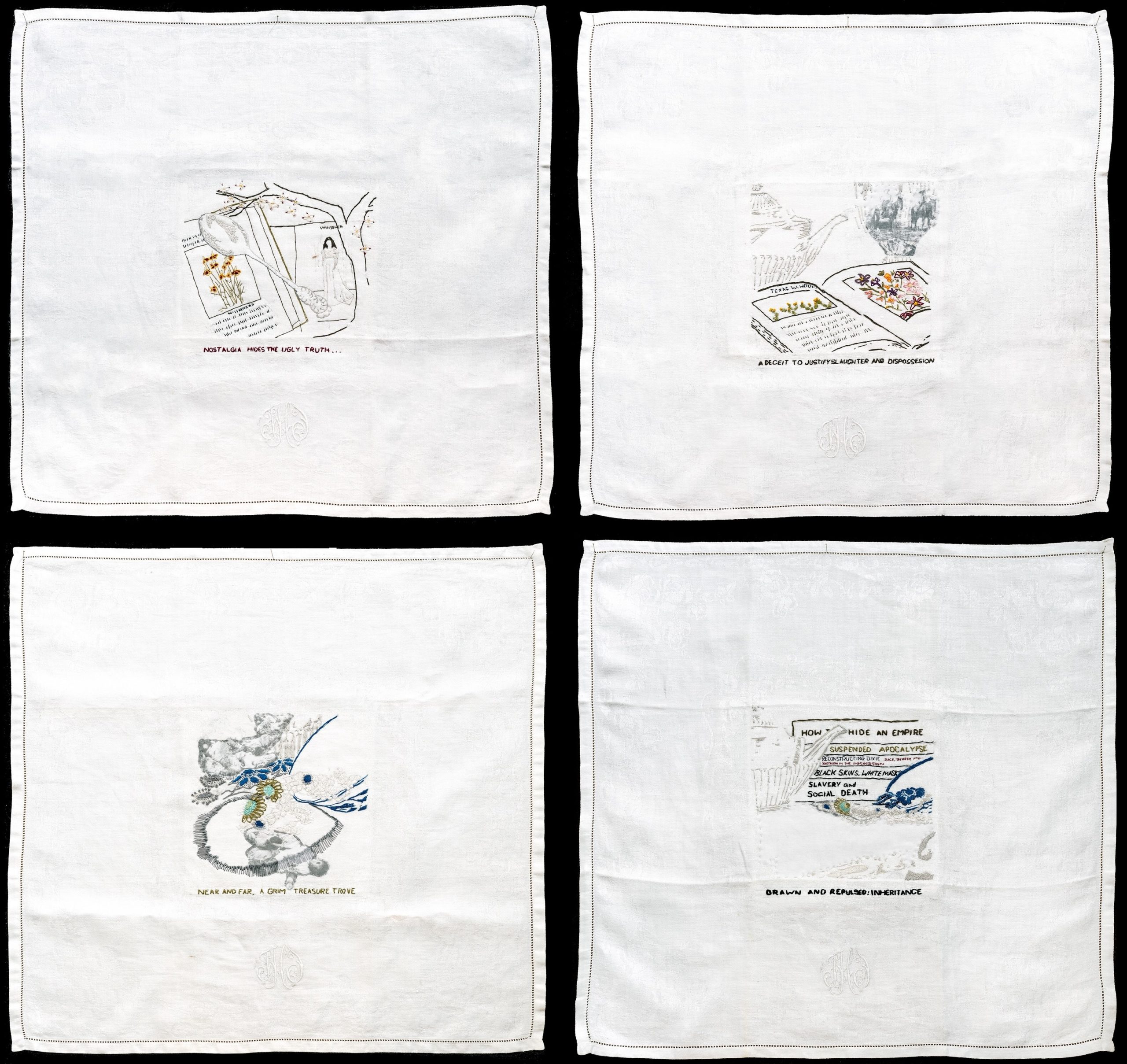 Series composed of four inherited monogramed napkins embroidered with silk and cotton thread with image transfer. 20" x 20"